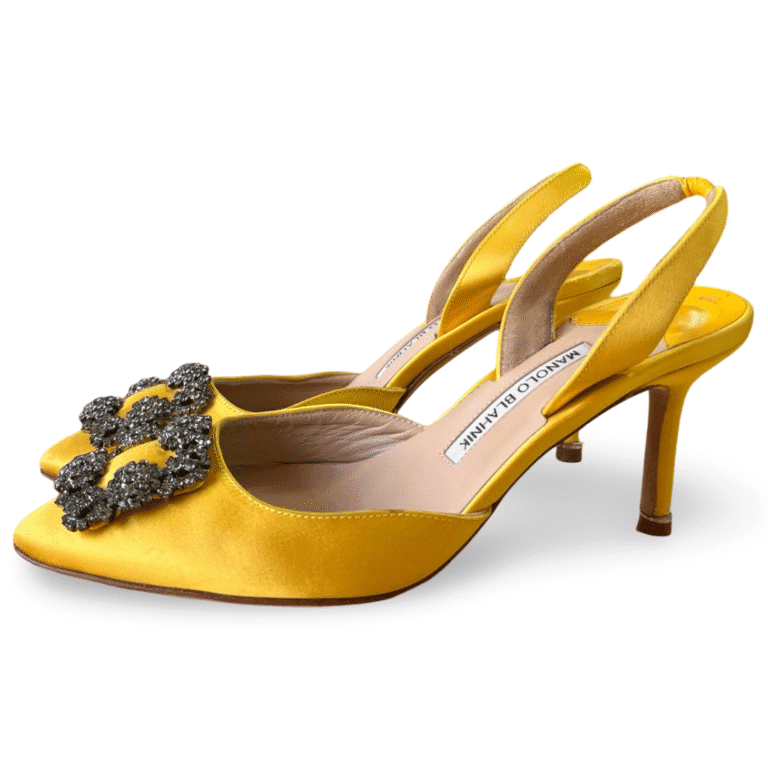 These Manolo Blahnik Hangisli pumps exude refined sophistication. Crafted from luxurious Byel (yellow-gold) satin, they feature an almond toe adorned