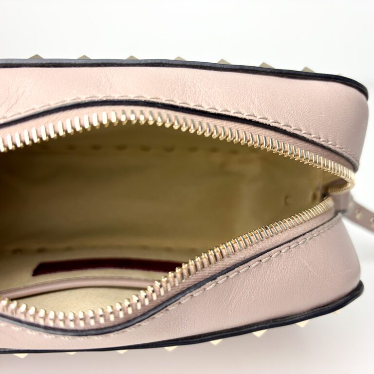 This chic Valentino Rockstud camera bag is crafted from smooth pastel pink leather, featuring the brand’s signature pale gold-tone Rockstud