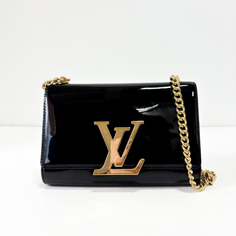 Elegant Louis Vuitton Chain Louise MM shoulder bag crafted in glossy black patent leather and finished with polished gold-tone hardware.