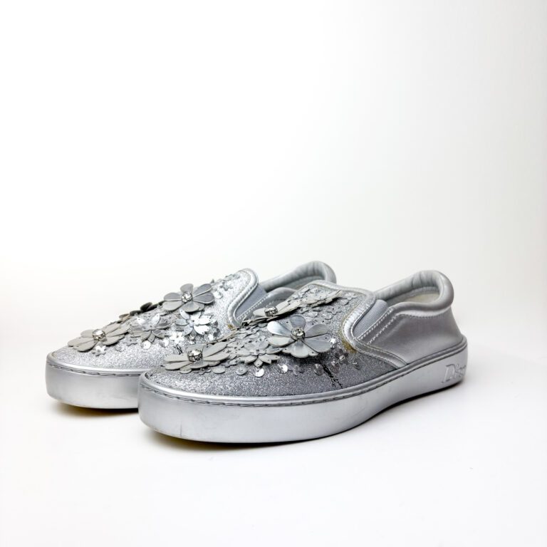 Christian Dior “Dior Happy” Slip-On Sneakers in Silver Leather & Glitter with Floral Sequin Embellishments — Size 38