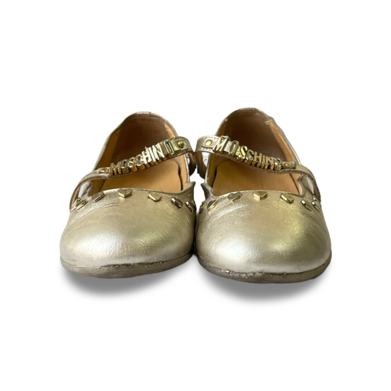 The Moschino Metallic Gold Ballet Flat is a stylish and playful shoe, perfect for adding a touch of glam to
