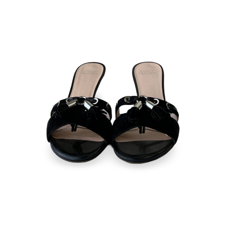 Stuart Weitzman Tasseled Black Patent Leather Slides