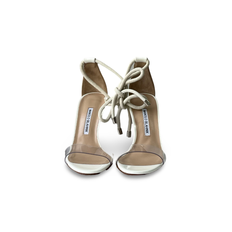 Manolo Blahnik PVC Patent White Leather Strap Ankle Tie Heels