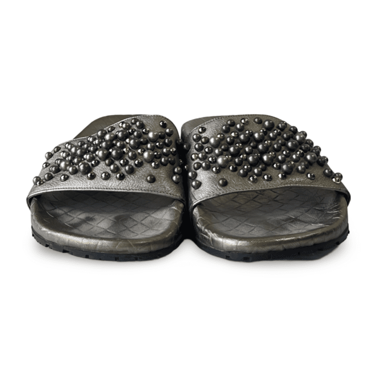 Bottega Veneta Dark-Green Embellished Leather Slides