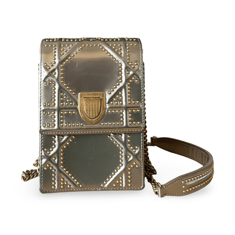 Elevate your evening ensemble with this Christian Dior Diorama clutch. Crafted from luxurious champagne glossy leather with signature studded detailing,