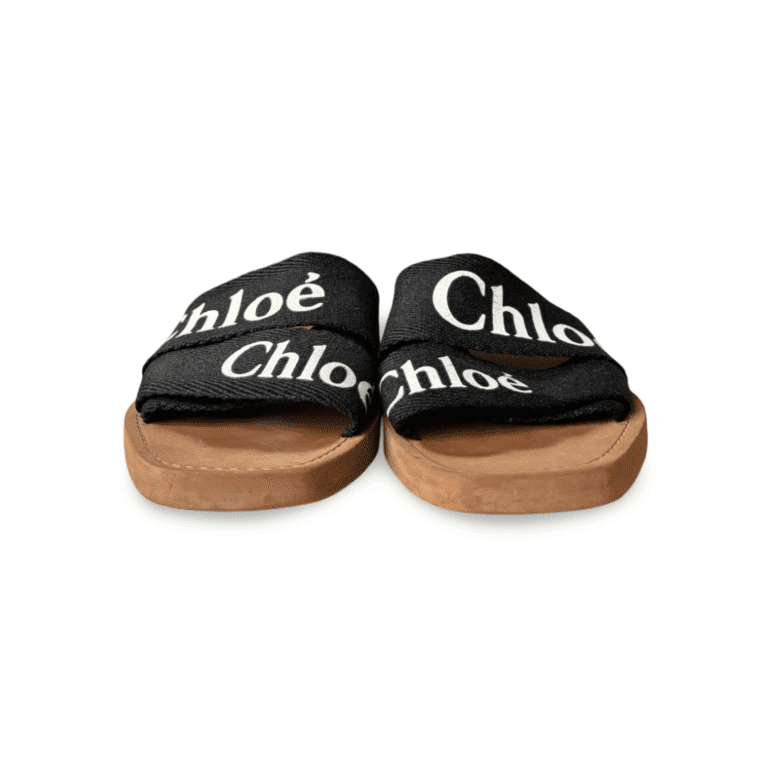 Chloé Woody Flat Slide Black Canvas with Logo Ribbon – Size 39