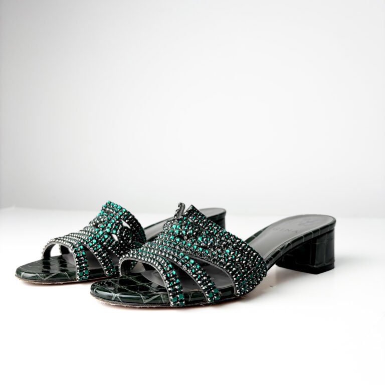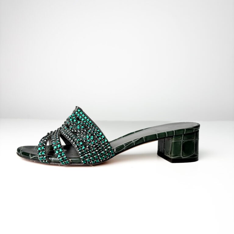 Gina Green Croc-Embossed Patent Leather with Crystal Embellishments Stirling Block Heel Sandals — Size 5 UK