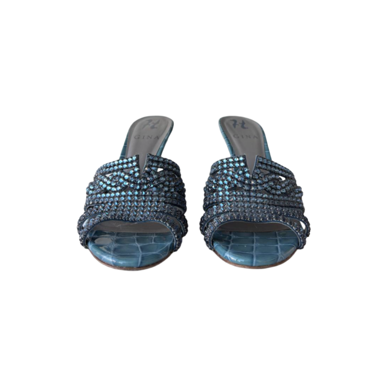 Gina Loren Blue Croc-Embossed Leather Crystal-Embellished Sandals — 4 1/2 (Size 37.5)