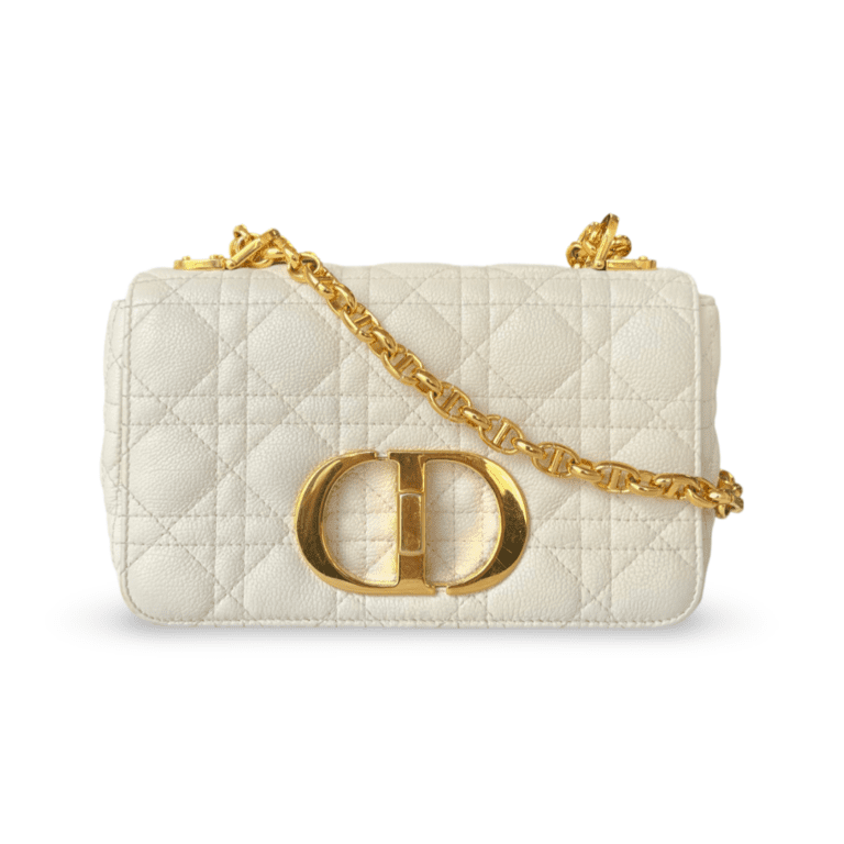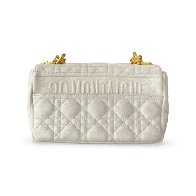 The Dior 30 Montaigne Caro Small Flap Bag in Ivory Supple Cannage Calfskin is a refined and elegant handbag that