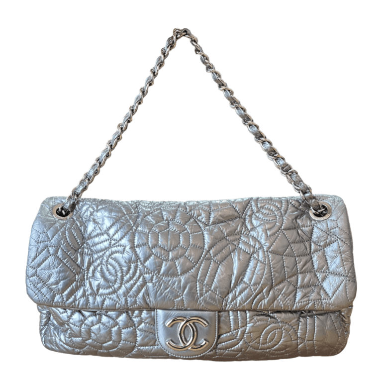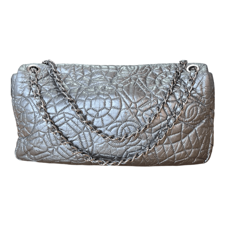 The Chanel Silver Patent Vinyl Graphic Edge Classic Flap Bag is a striking and futuristic take on the iconic Classic