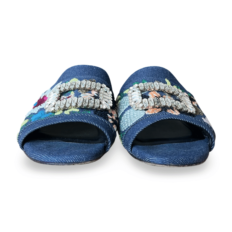 Roger Vivier Strass-Buckle Floral Denim Slide Sandals Size 38
