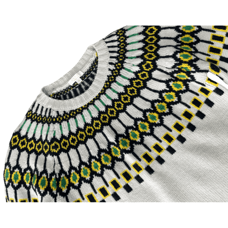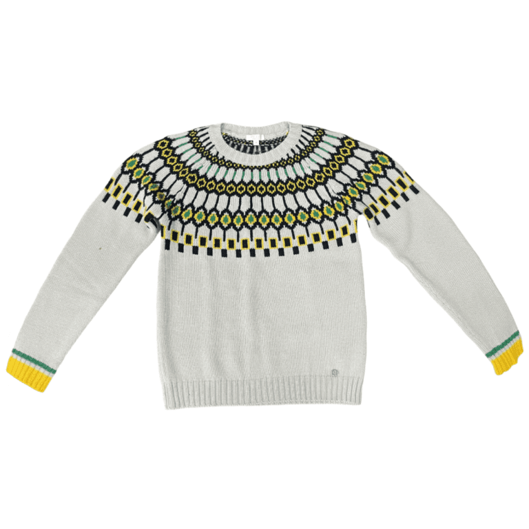 This Gucci Kid’s Boy’s Crew Neck Sweater is a stylish and versatile piece, combining neutral tones with multicolor accents. It