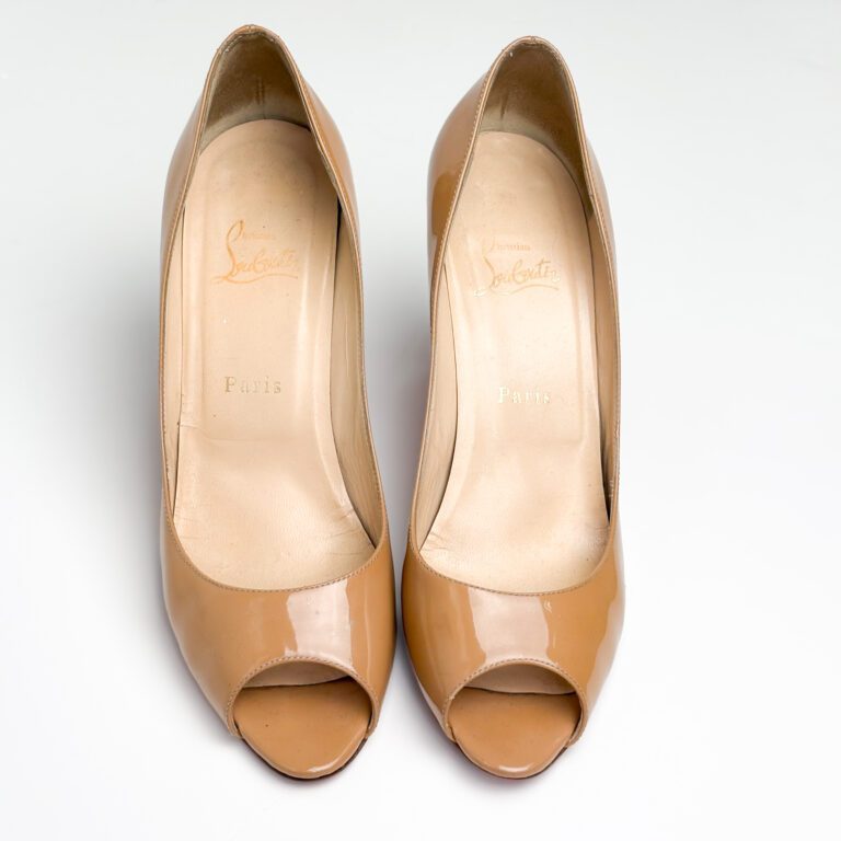 Christian Louboutin Beige Patent Leather Flo Peep Toe Pumps Size 39.5