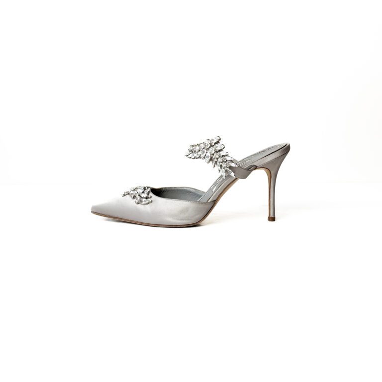 Manolo Blahnik Grey Satin Crystal Embellished Lurum Sandals, Size 39
