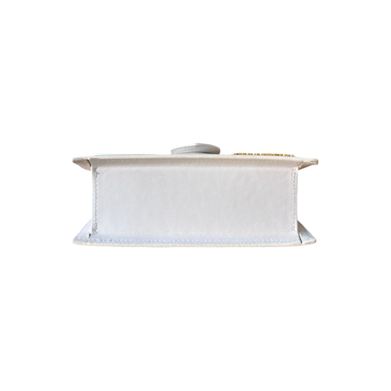This chic Jacquemus Mini Le Bambino bag is crafted from smooth white leather, showcasing the brand’s signature structured silhouette and