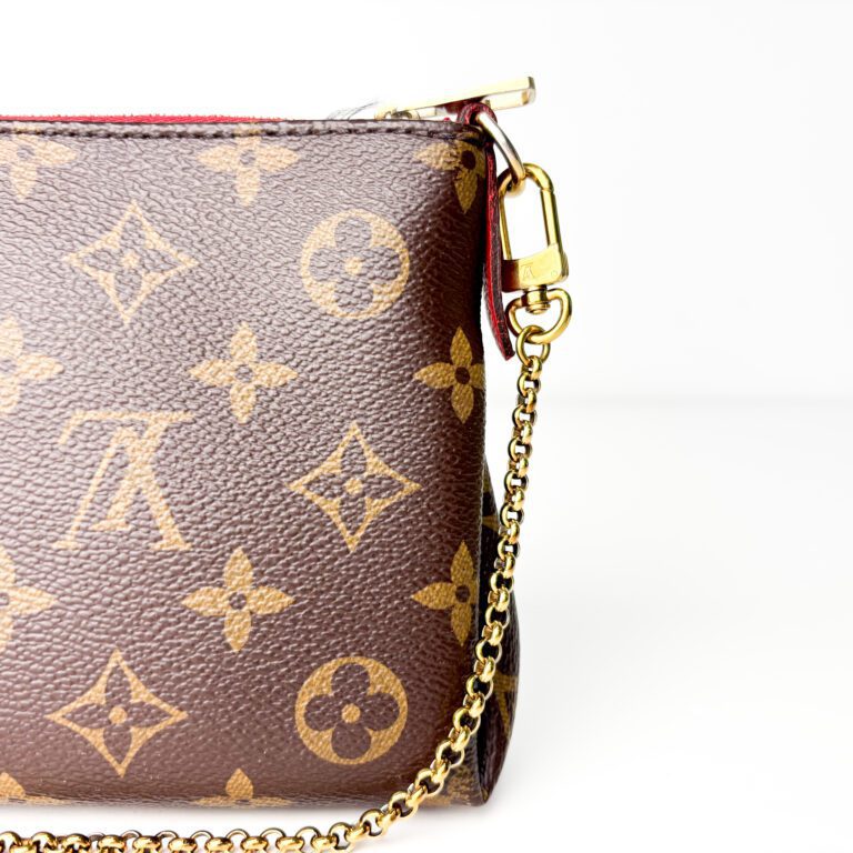 This elegant Louis Vuitton Pallas clutch is crafted from the brand’s iconic Monogram coated canvas, accented with bold red leather