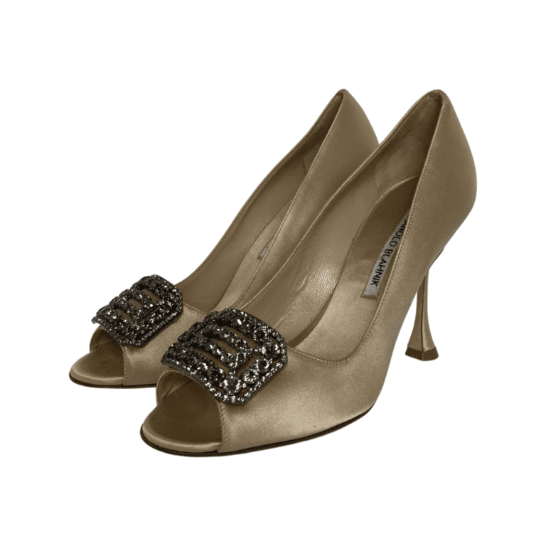 The Manolo Blahnik Beige Satin Matik Peep Toe Pumps exude elegance and sophistication, featuring a luxurious beige satin exterior and