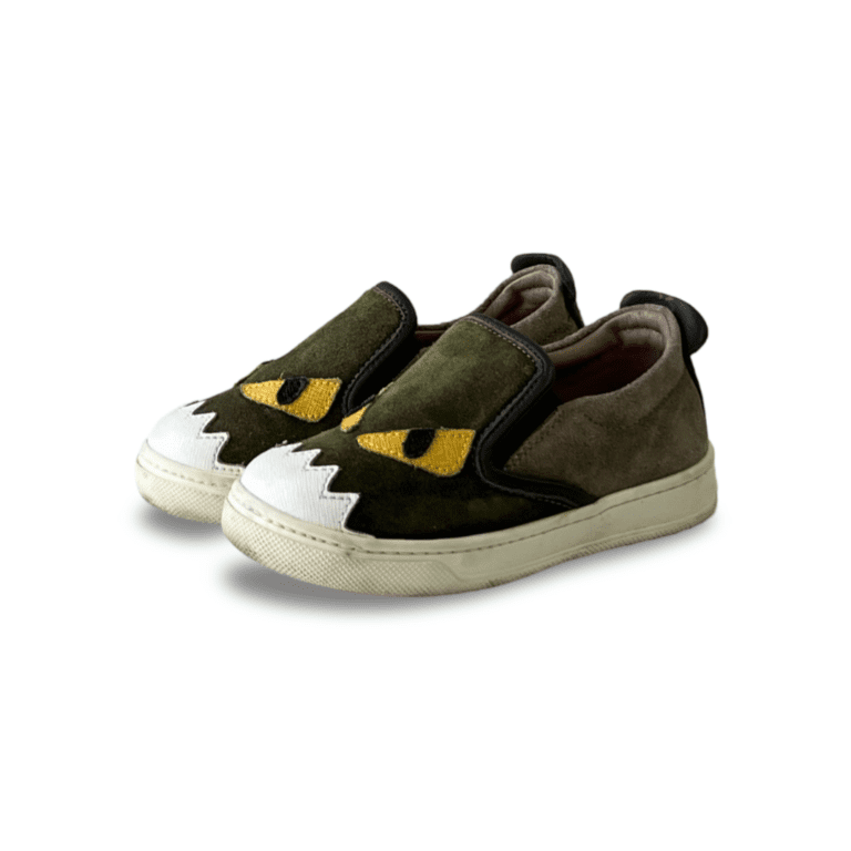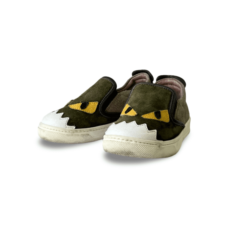 The Fendi Monster slip-on shoes in size 25 are fun and stylish footwear designed for kids. Featuring playful monster motifs,