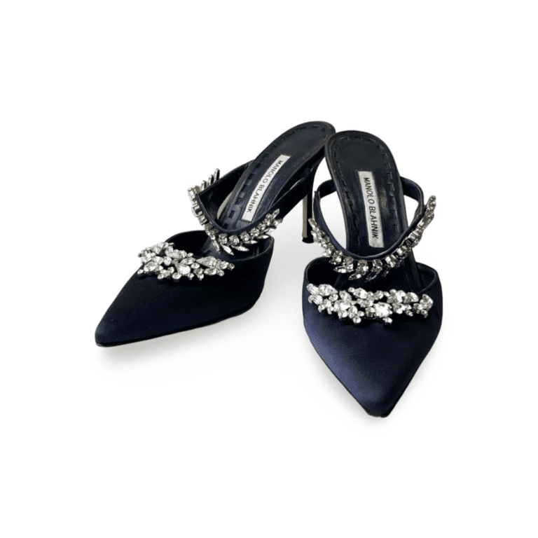 Manolo Blahnik Navy Lurum 90 Crystal-Embellished Satin Mules, Size 39