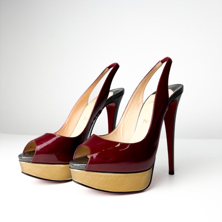Christian Louboutin Lady Peep Burgundy Patent Leather Sling Platform Pumps — Size 39