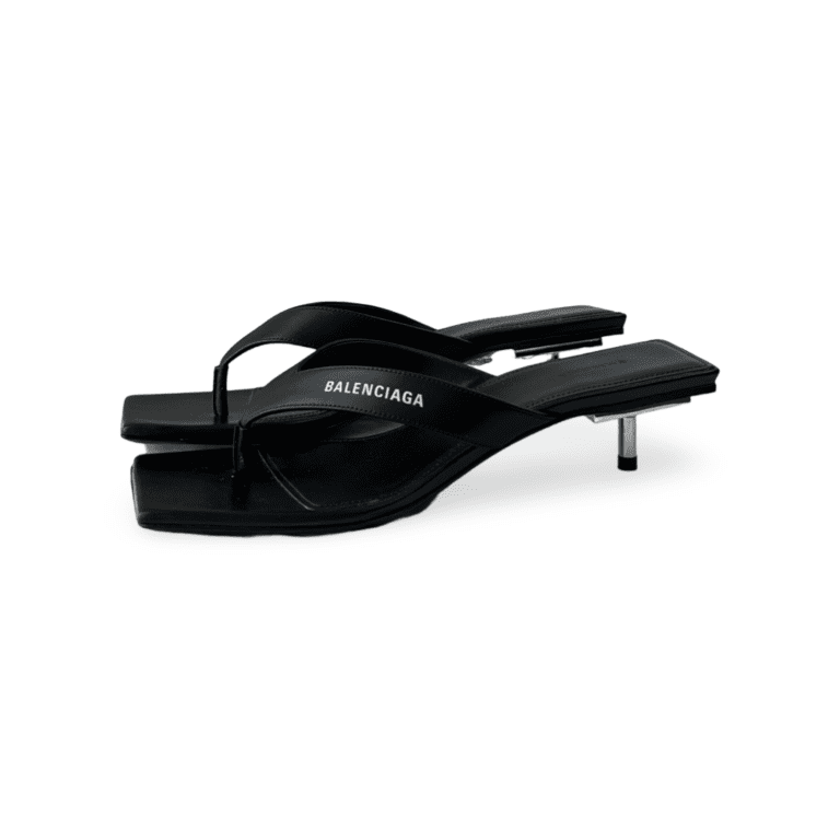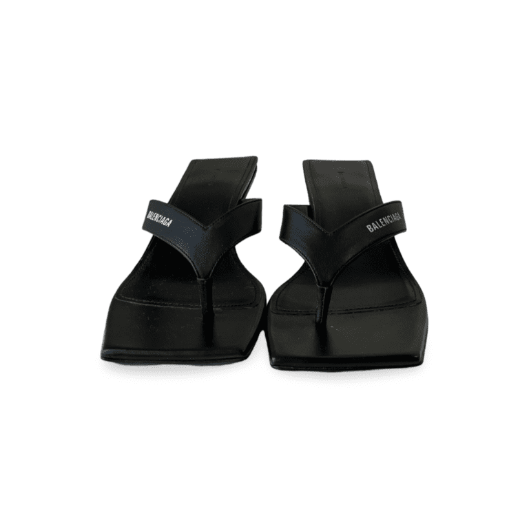 The Balenciaga Black Leather Square Toe Thong Slide Sandals offer a sleek and modern design, combining luxurious leather craftsmanship with