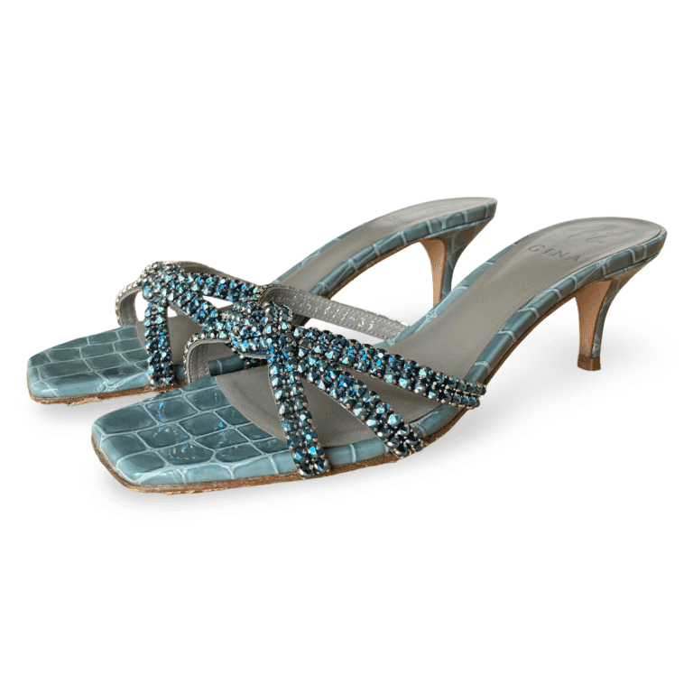 Gina Square-Toe Mules in Teal Croc-Embossed Leather with Crystal Embellishments – Size 39