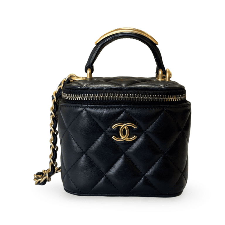 The Chanel Black Mini Vanity Case Top Handle Bag is a sophisticated and compact accessory that embodies timeless Chanel elegance.