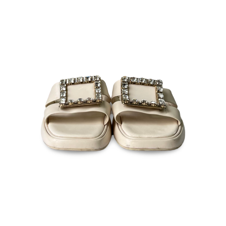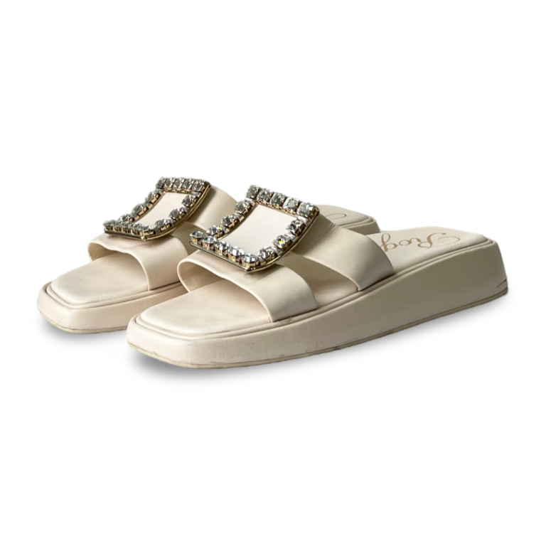 The Roger Vivier Slide Crystal Buckle Off-White Leather Mule is a luxurious and elegant footwear choice, blending classic design with