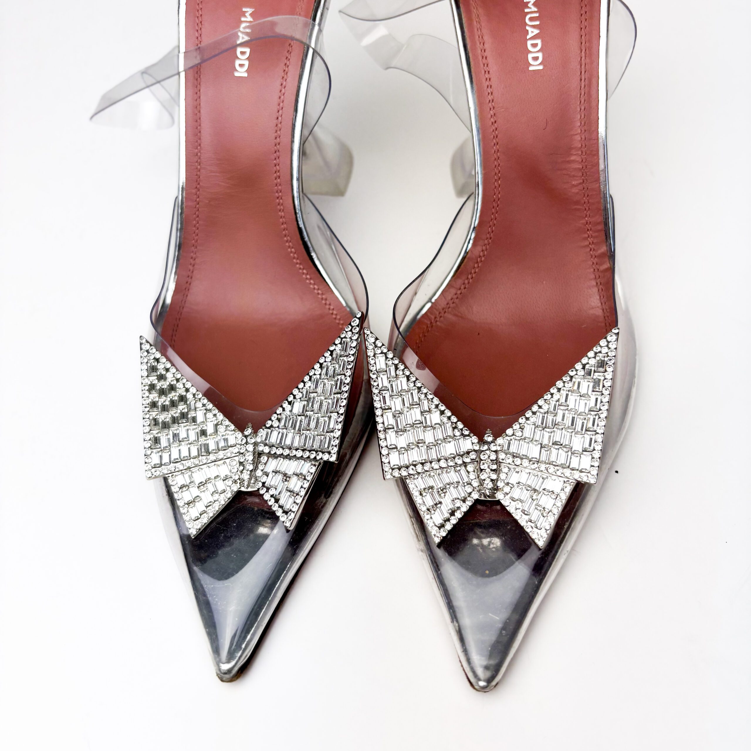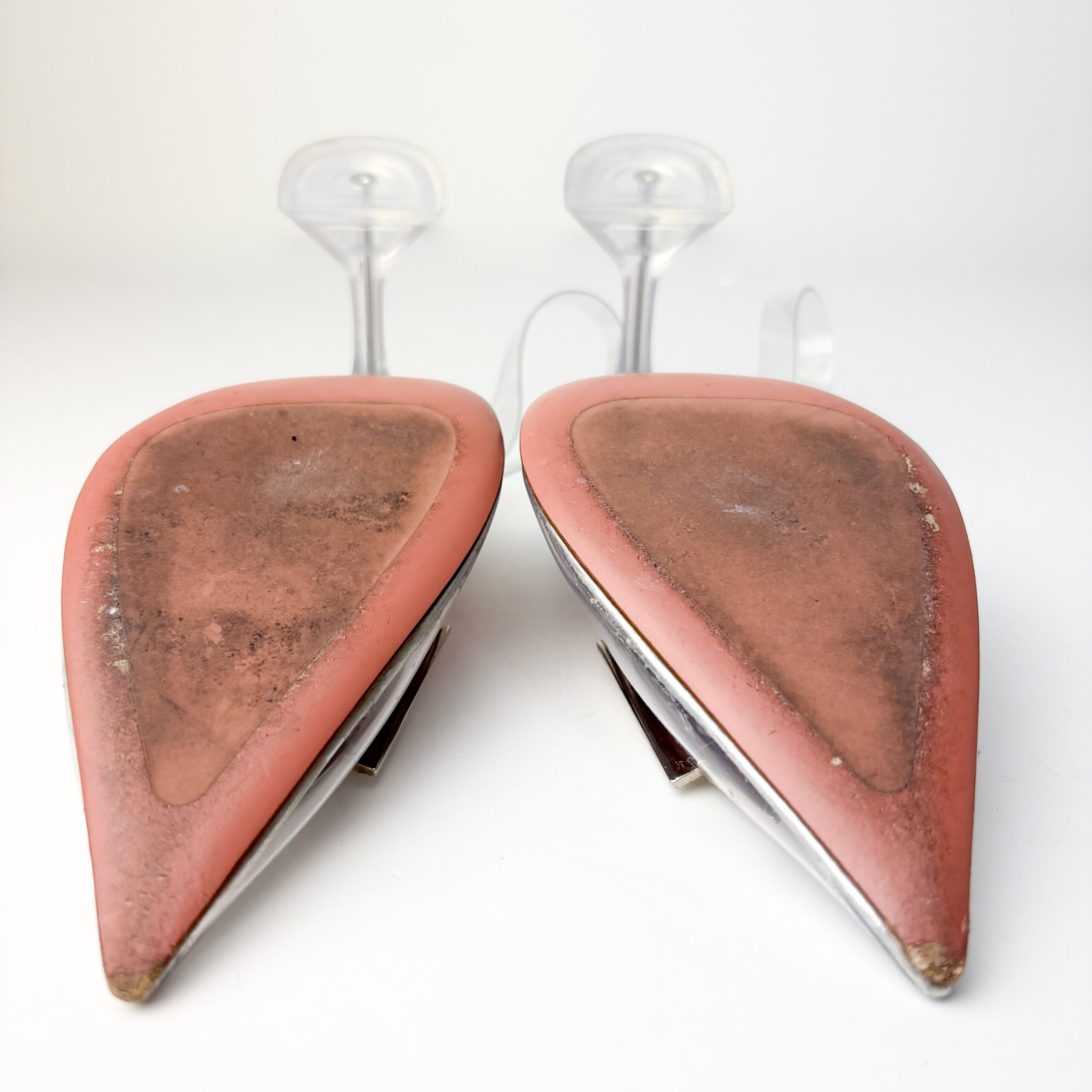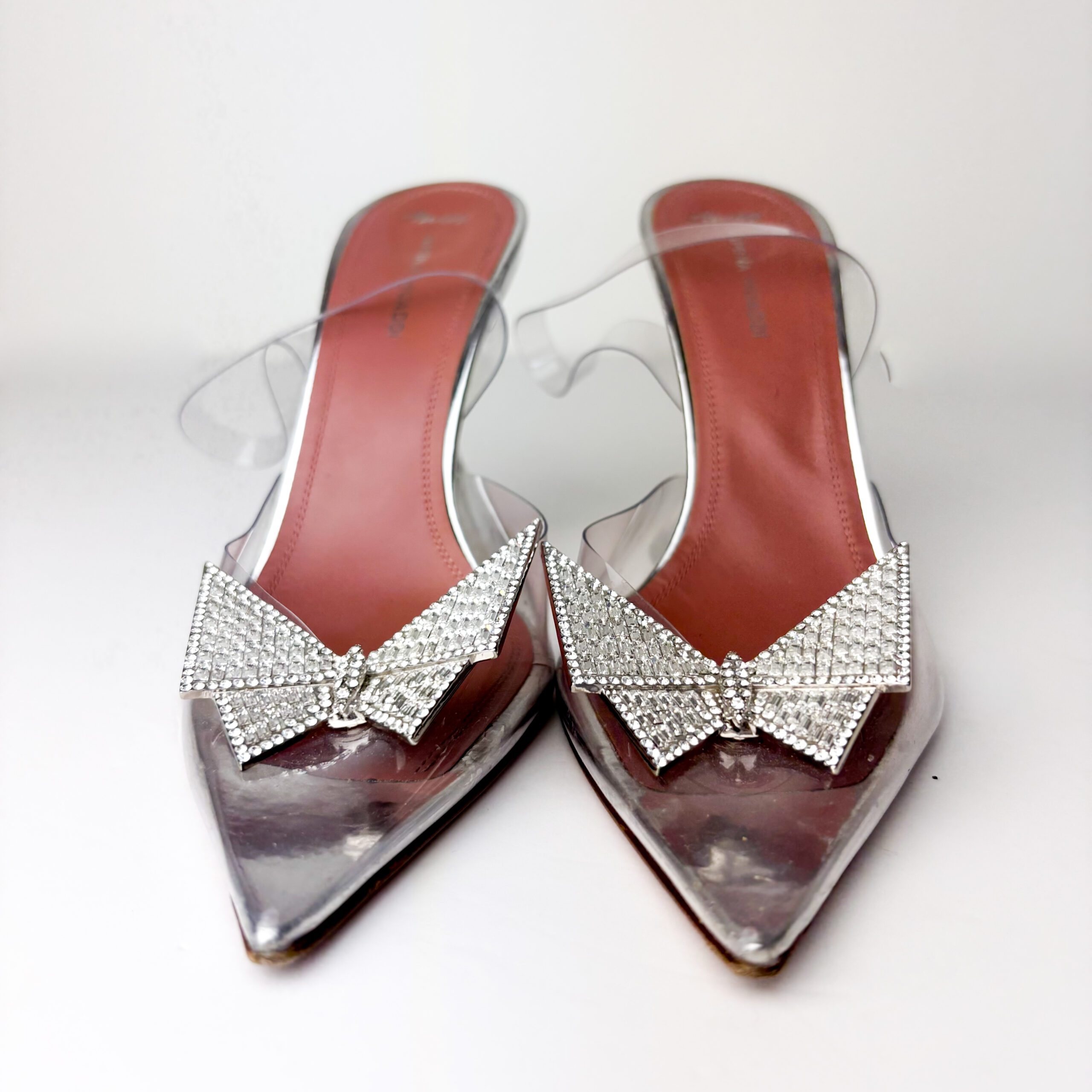 - Condition Summary (Pre-Owned): Good pre-owned condition. The PVC uppers are clear with no yellowing or cloudiness. Crystal butterfly embellishments remain intact and bright. Leather insoles show visible darkening and toe imprints, with minor fading of branding. Leather outsoles exhibit significant scuffing and wear from outdoor use, while the martini heels are structurally sound with only light surface wear at the heel caps.