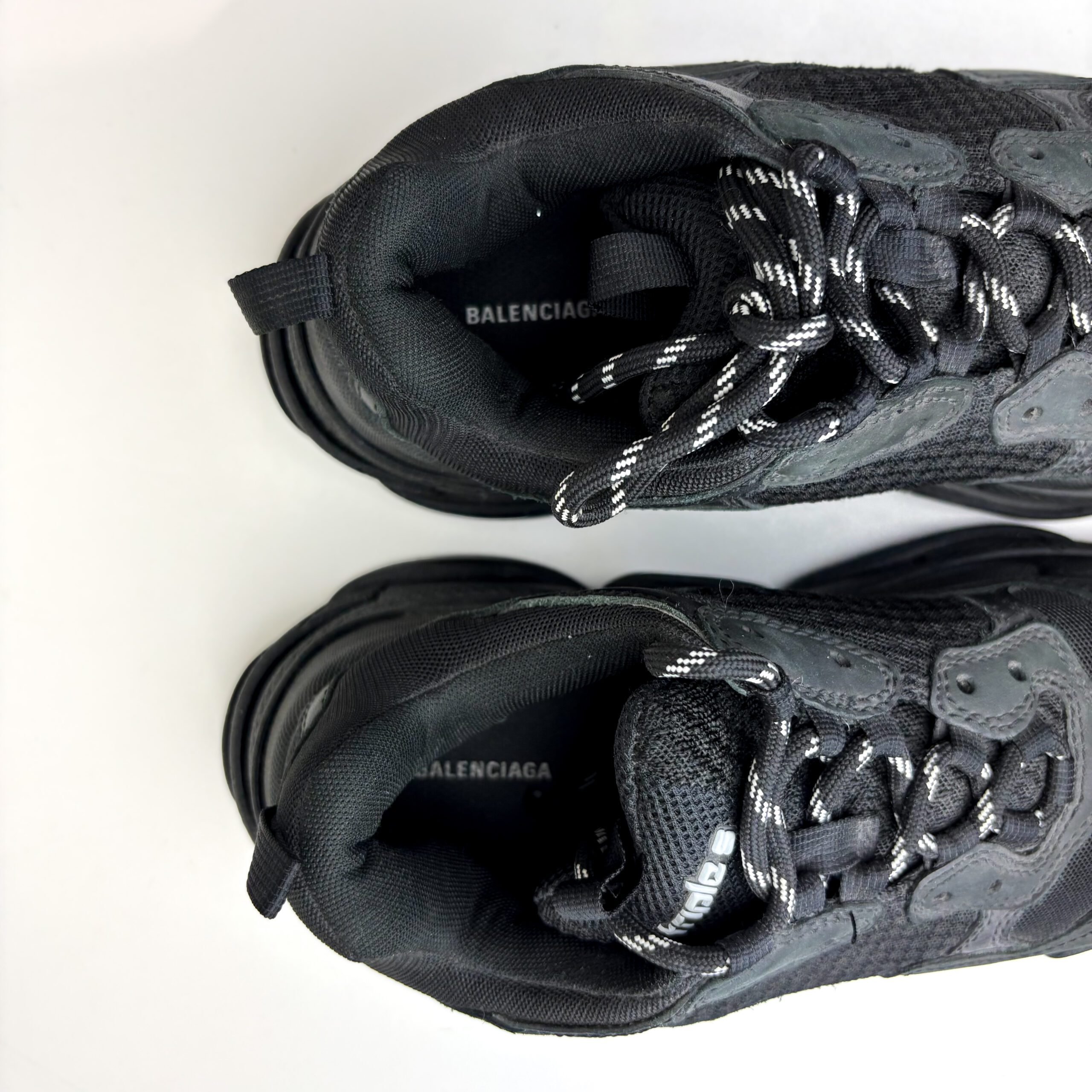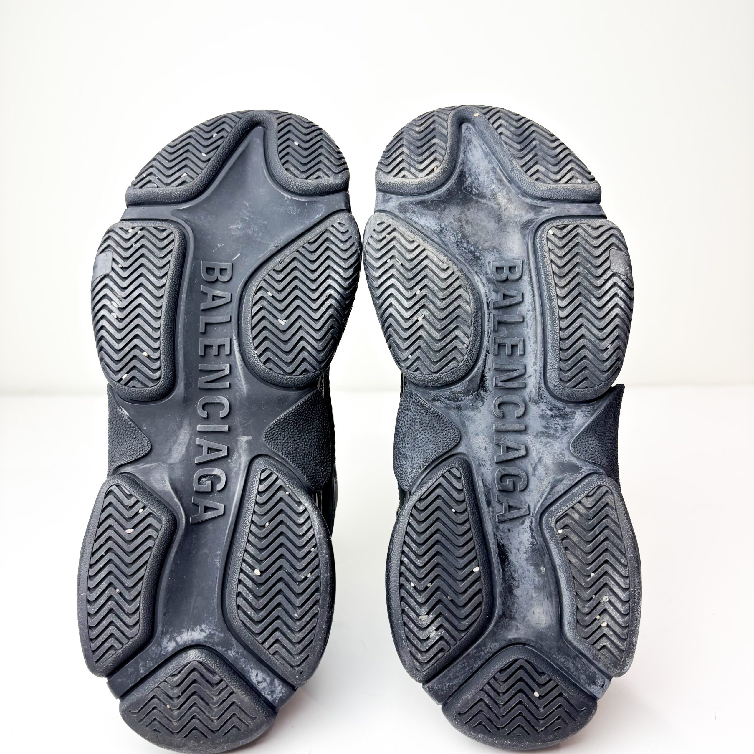- Condition Summary (Pre-Owned): Very good pre-owned condition. The mesh and fabric uppers are clean and intact with no significant fraying or damage. The embroidered “BALENCIAGA” logos remain sharp, and the rubber outsoles show light outdoor wear with minor dirt in the treads but no substantial wear to the layered sole structure.