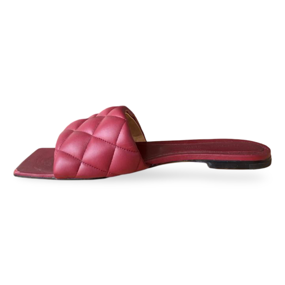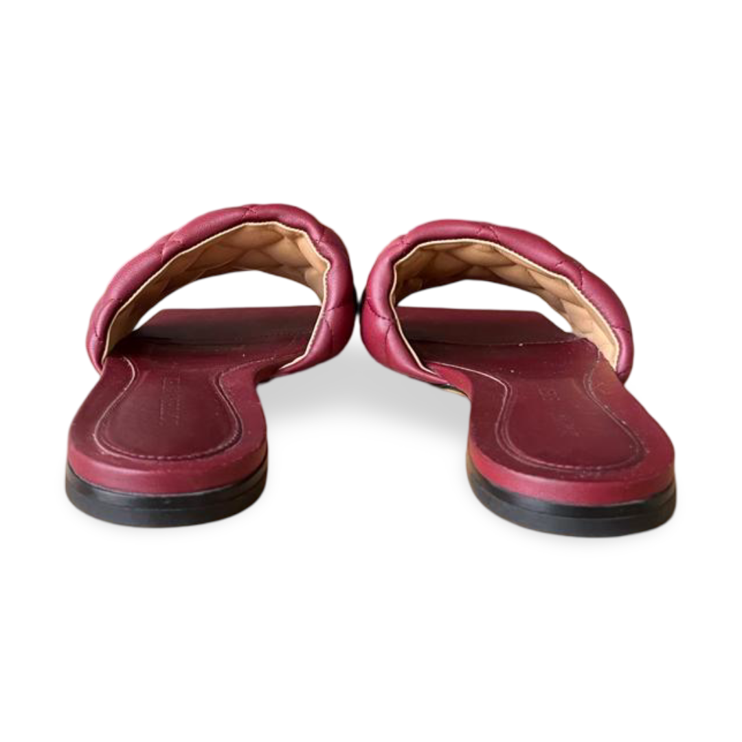 These Bottega Veneta Lido Slides feature the brand’s iconic oversized intrecciato woven leather in a rich burgundy shade. Crafted in supple lambskin with a flat silhouette, they combine understated luxury with everyday comfort.