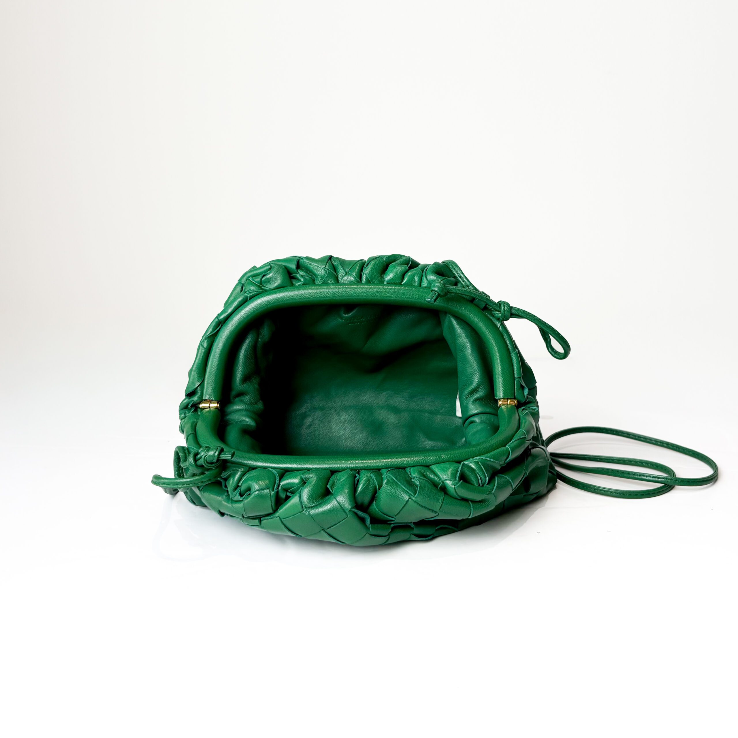 A signature Bottega Veneta Mini Pouch crafted in soft green intrecciato woven leather. This iconic clutch features a gathered magnetic frame closure and a supple, cloud-like silhouette that is both modern and timeless.