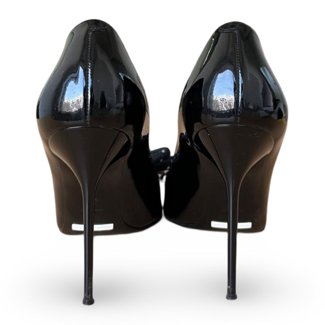 These Burberry Finsbury Pumps are crafted from glossy black patent leather and feature a chic pointed toe with a signature bow detail on the vamp. Set on a striking 110 mm stiletto heel, they offer an elegant, elongated silhouette—perfect for evening looks and dressy occasions.