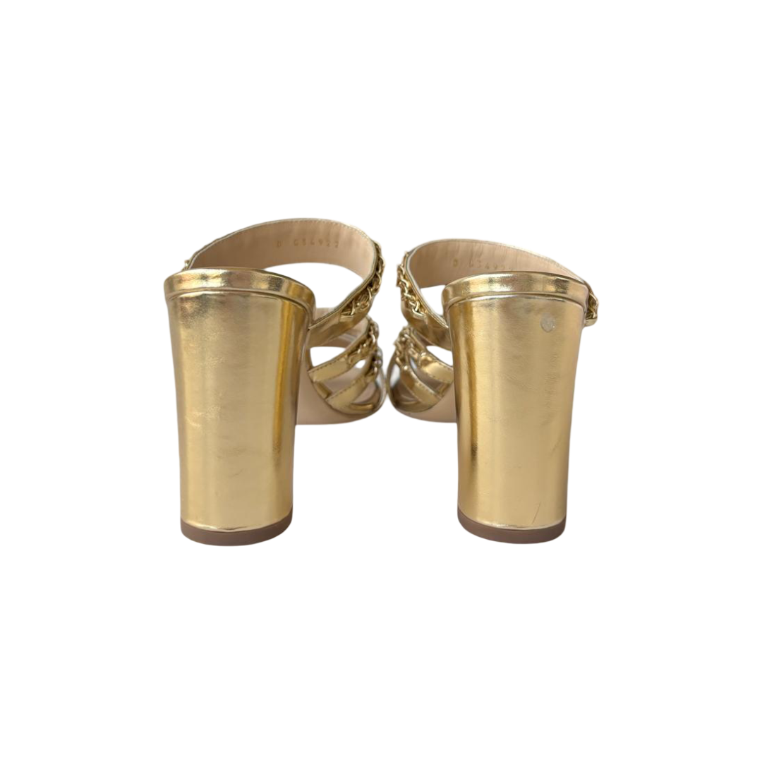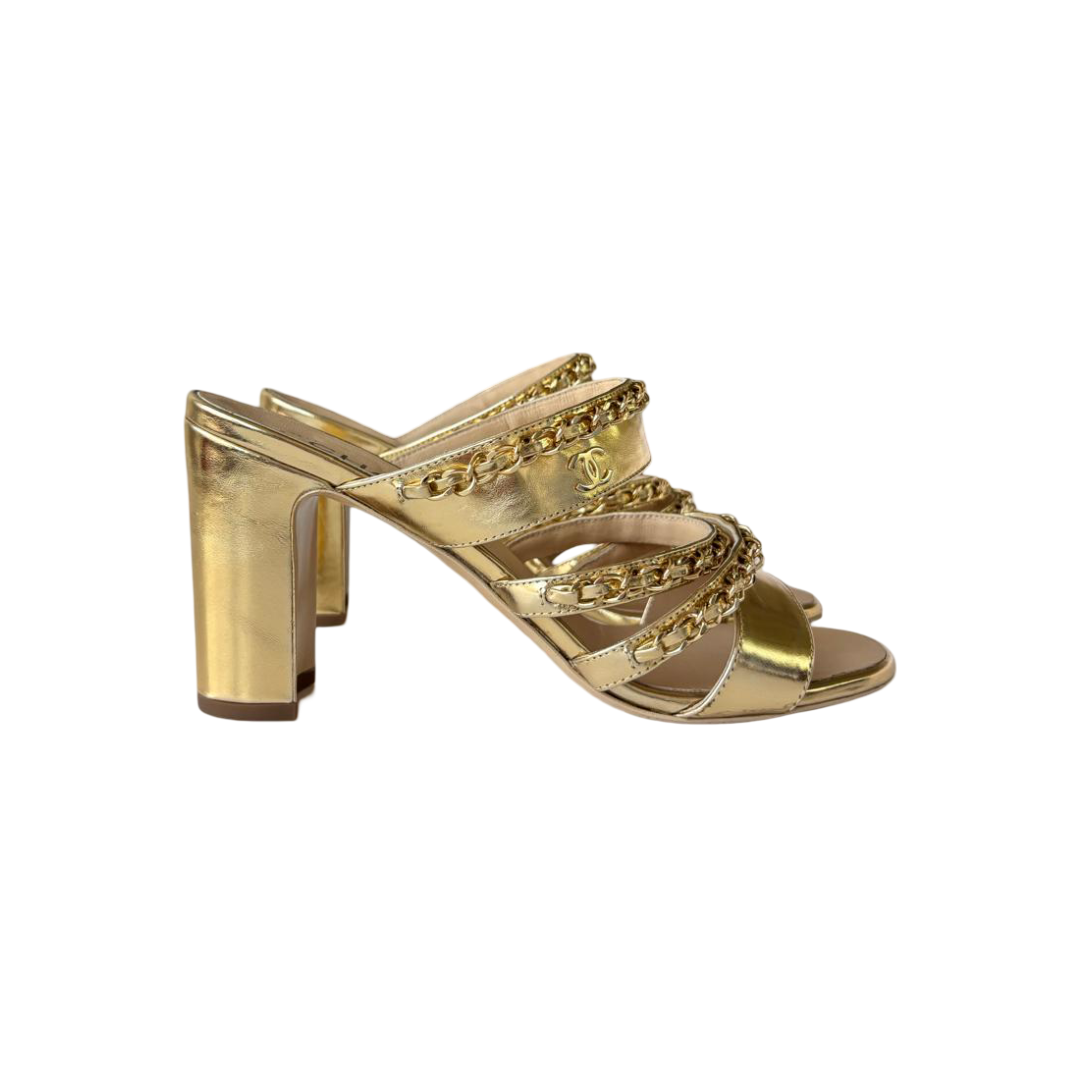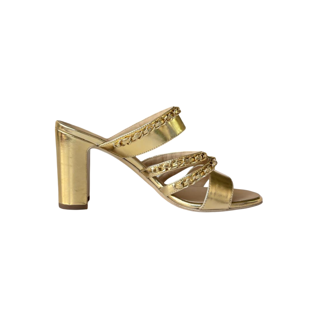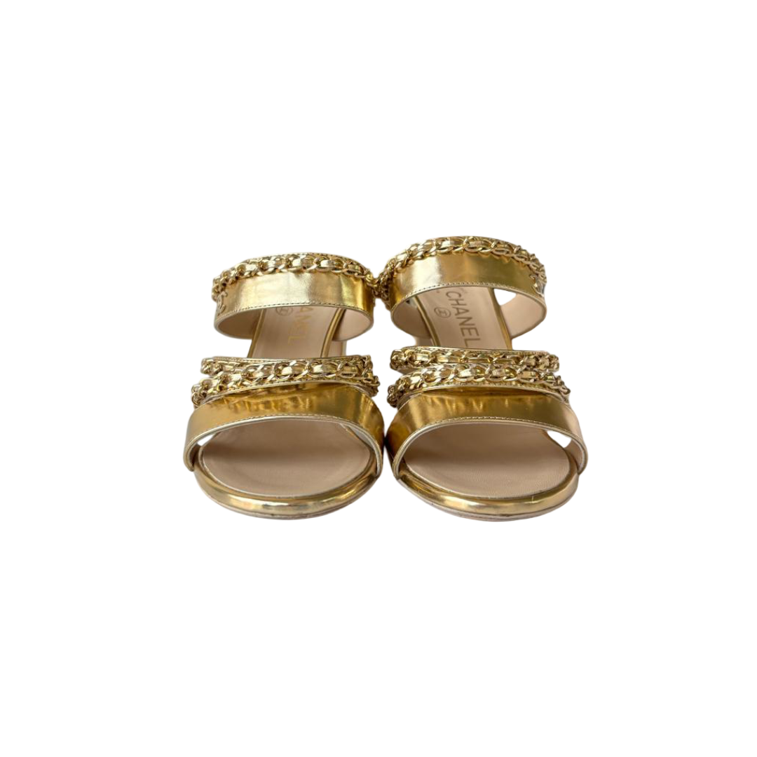 Chanel Gold Leather Chain-Embellished Block Heel Slide Sandals — Size 37C
