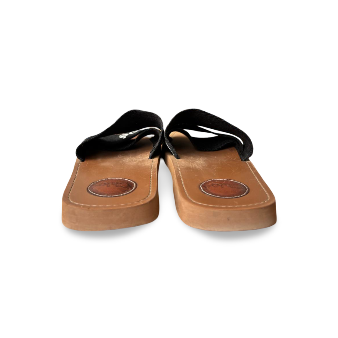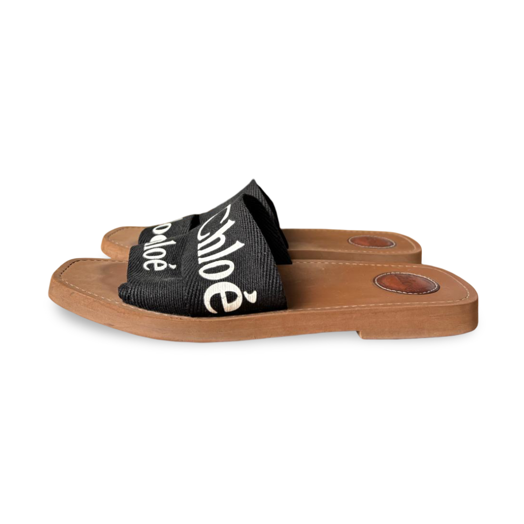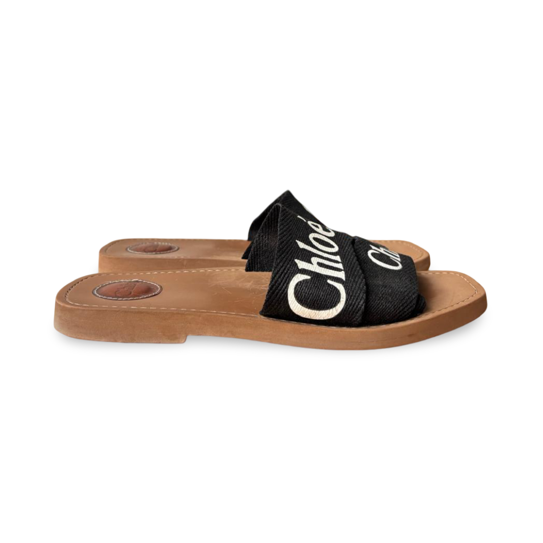 The iconic Chloé Woody flat slide is a modern warm-weather essential, crafted in black canvas and finished with the brand’s signature logo-print ribbon across the vamp. Effortlessly chic and comfortable, this minimalist slide pairs perfectly with both casual and elevated summer looks.