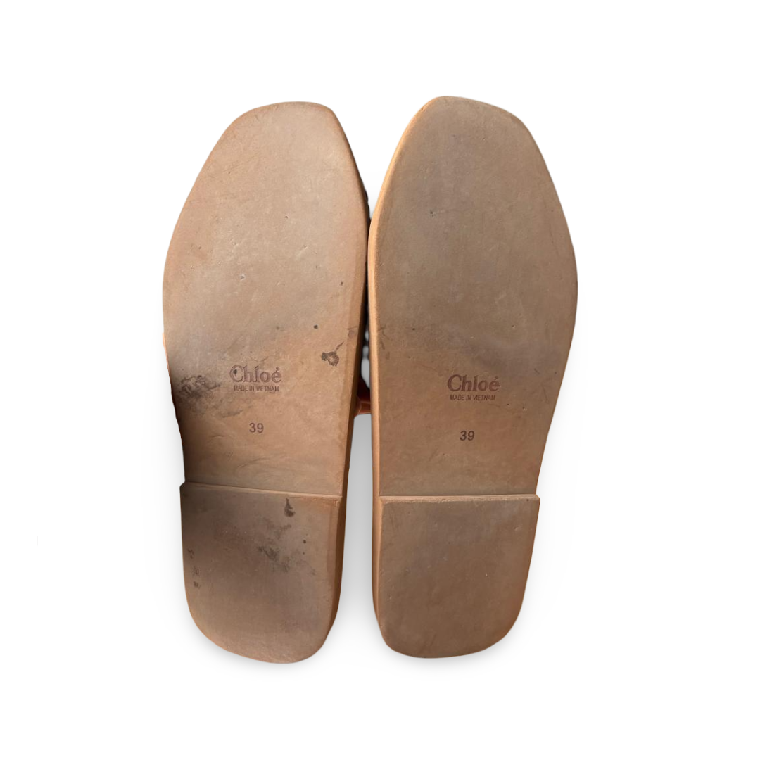 - Pre-Owned Condition: The slides are in excellent, gently used condition. It clearly shows the tan leather footbed with a few very light surface scratches or scuff marks, which is consistent with minimal or gentle use.