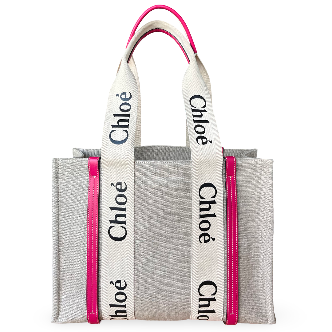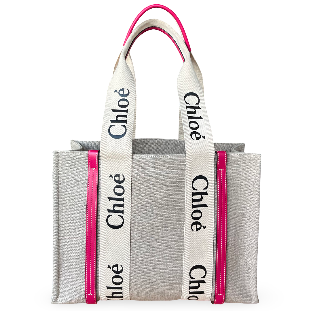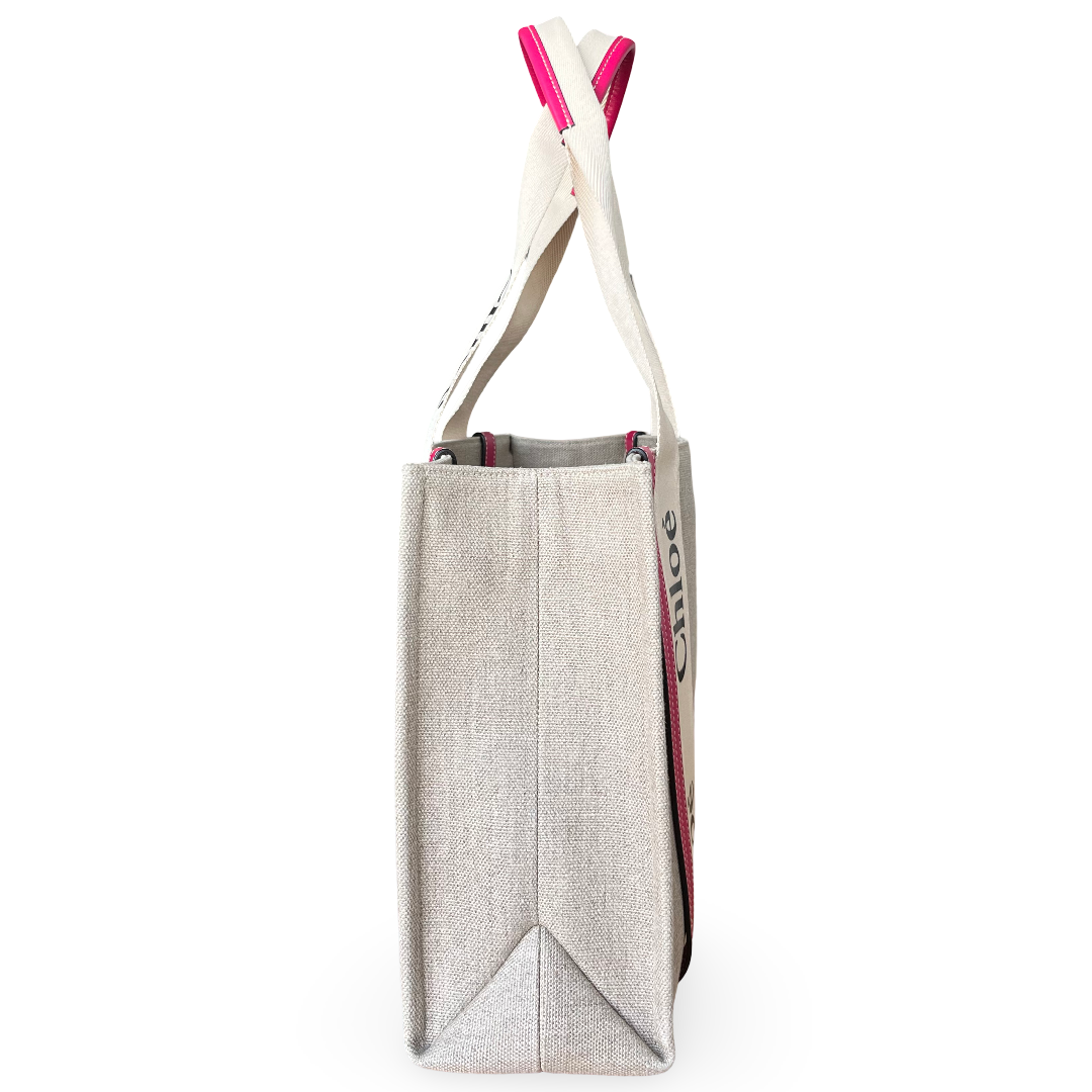 The ChloƩ Woody Medium Tote Bag is crafted from durable canvas with contrasting leather trims and the signature ChloƩ logo webbing straps. Its structured design offers ample space for daily essentials, making it perfect for casual chic styling.