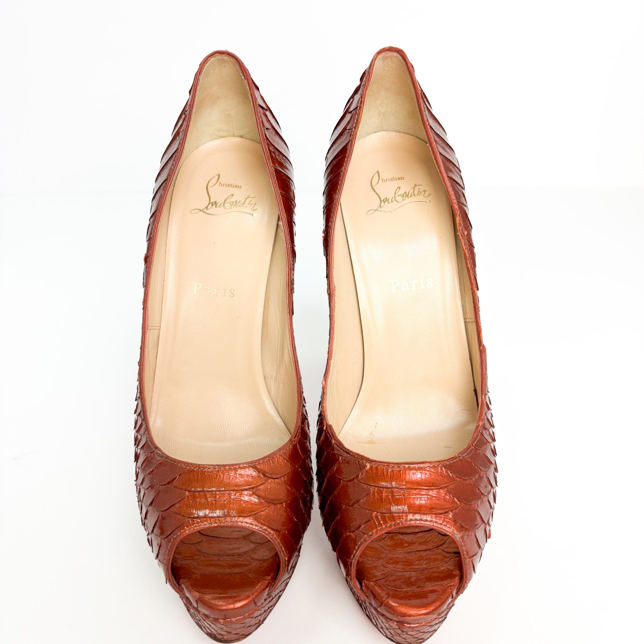 - Condition Summary (Pre-Owned): Good pre-owned condition with visible wear consistent with use. The python leather uppers remain vibrant with minor natural scale lifting, though there is a noticeable separation at the platform edge on one shoe that may need repair. Heel taps and red lacquer soles show significant wear, while the insoles have light darkening and the branding remains clear.