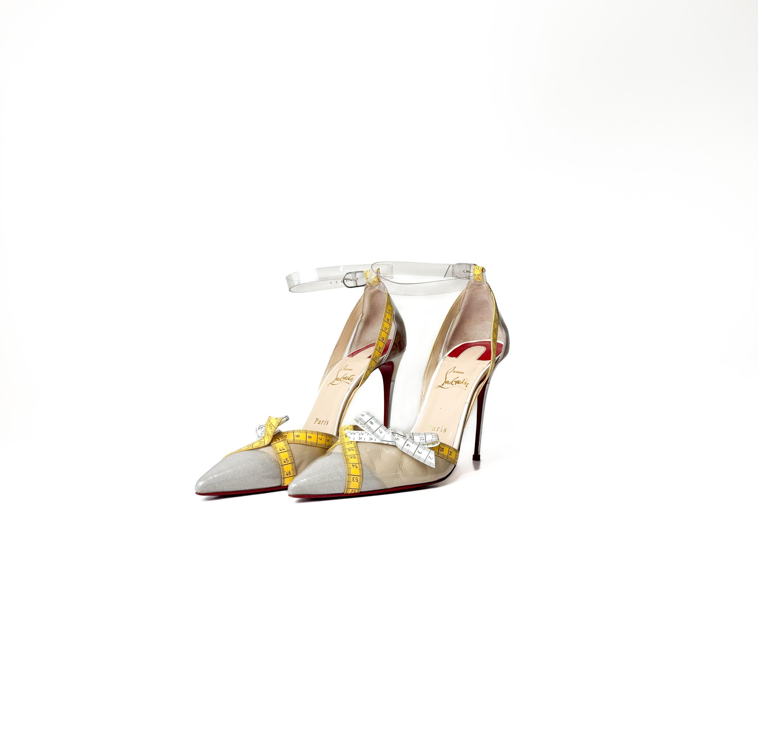 - Condition Summary (Pre-Owned): Good pre-owned condition. The red lacquer soles show heavy wear at the balls of the feet with paint worn through to the leather, and the heel tips are rounded from use. The clear PVC shows light scuffing and slight clouding, the measuring tape trim has minor fraying at the edges, and the pointed toes show light darkening. Insoles show light footprinting, but the gold branding remains crisp and the metal heels are in good structural condition.