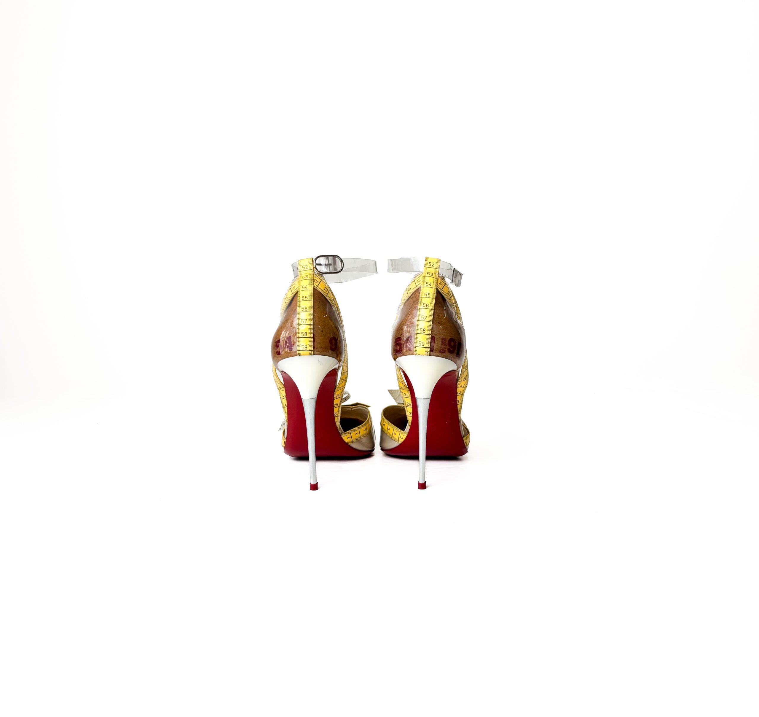 Limited edition Christian Louboutin Metripump pumps featuring transparent PVC with whimsical yellow and white measuring tape–style straps and bows. A true collector’s design, finished with pointed toes and sleek metal stiletto heels.