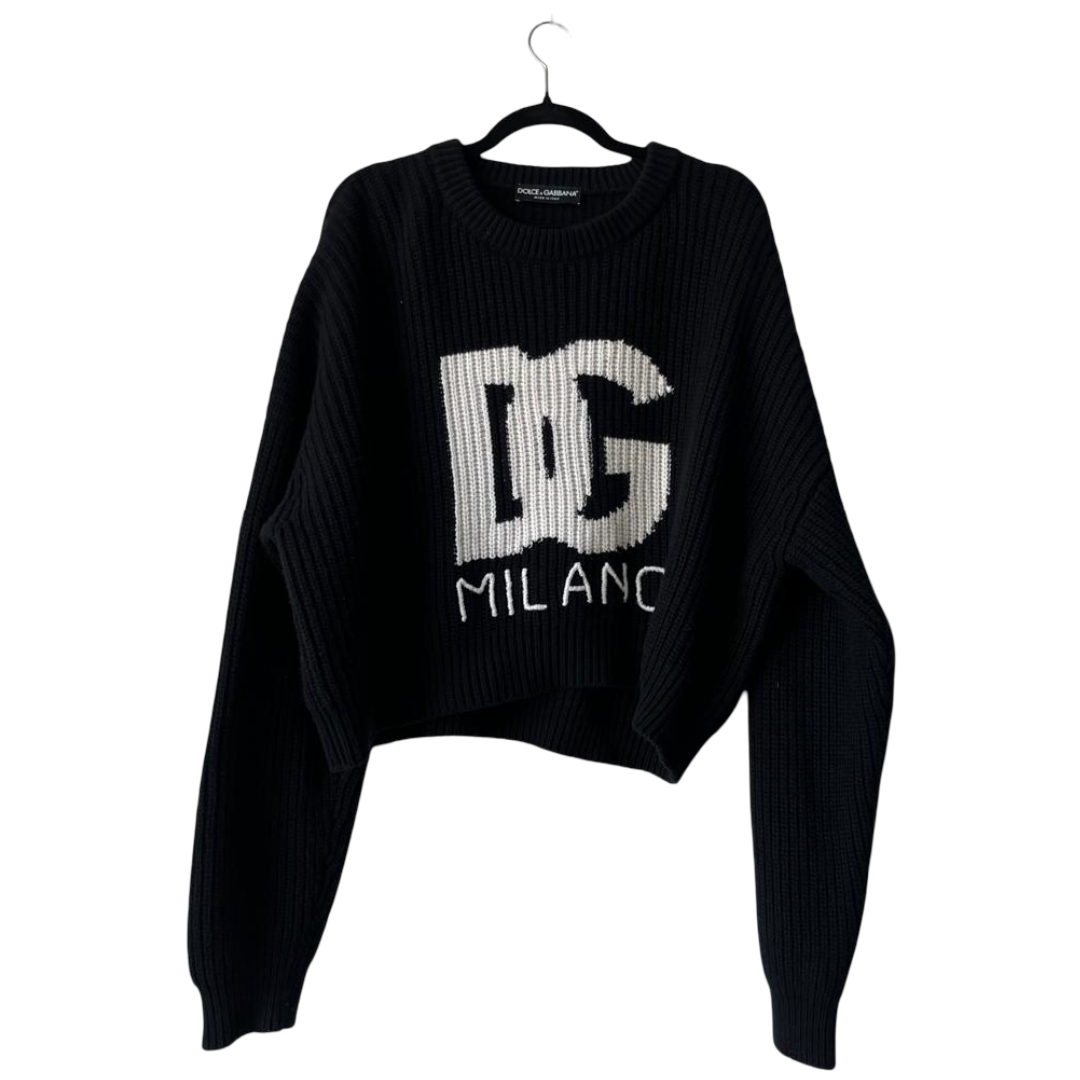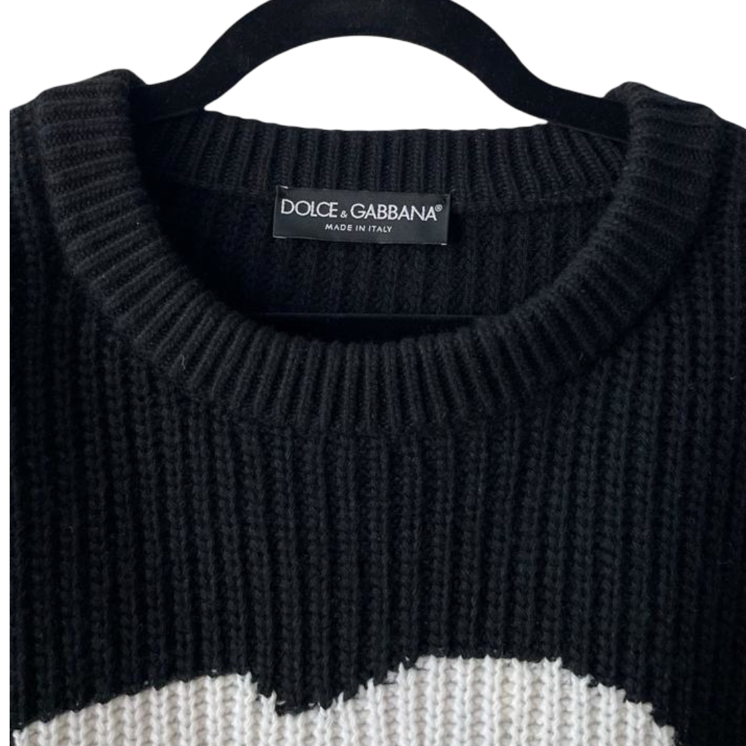 This Dolce & Gabbana cropped sweater showcases a luxurious fisherman-knit texture and features the brand’s signature DG logo on the front. Its cropped silhouette and thick knit construction make it an elegant yet cozy choice for transitional weather or layered styling.