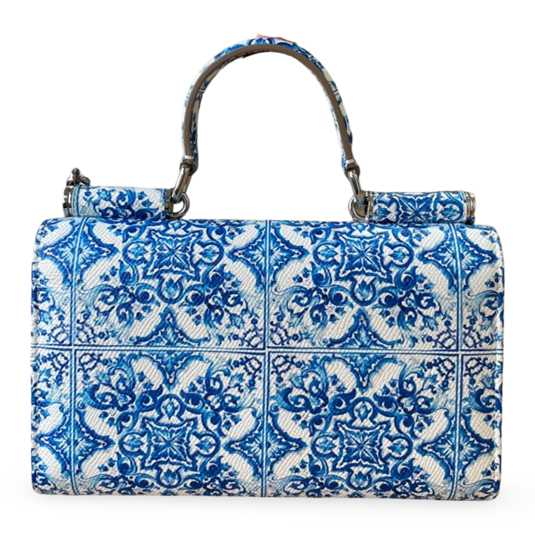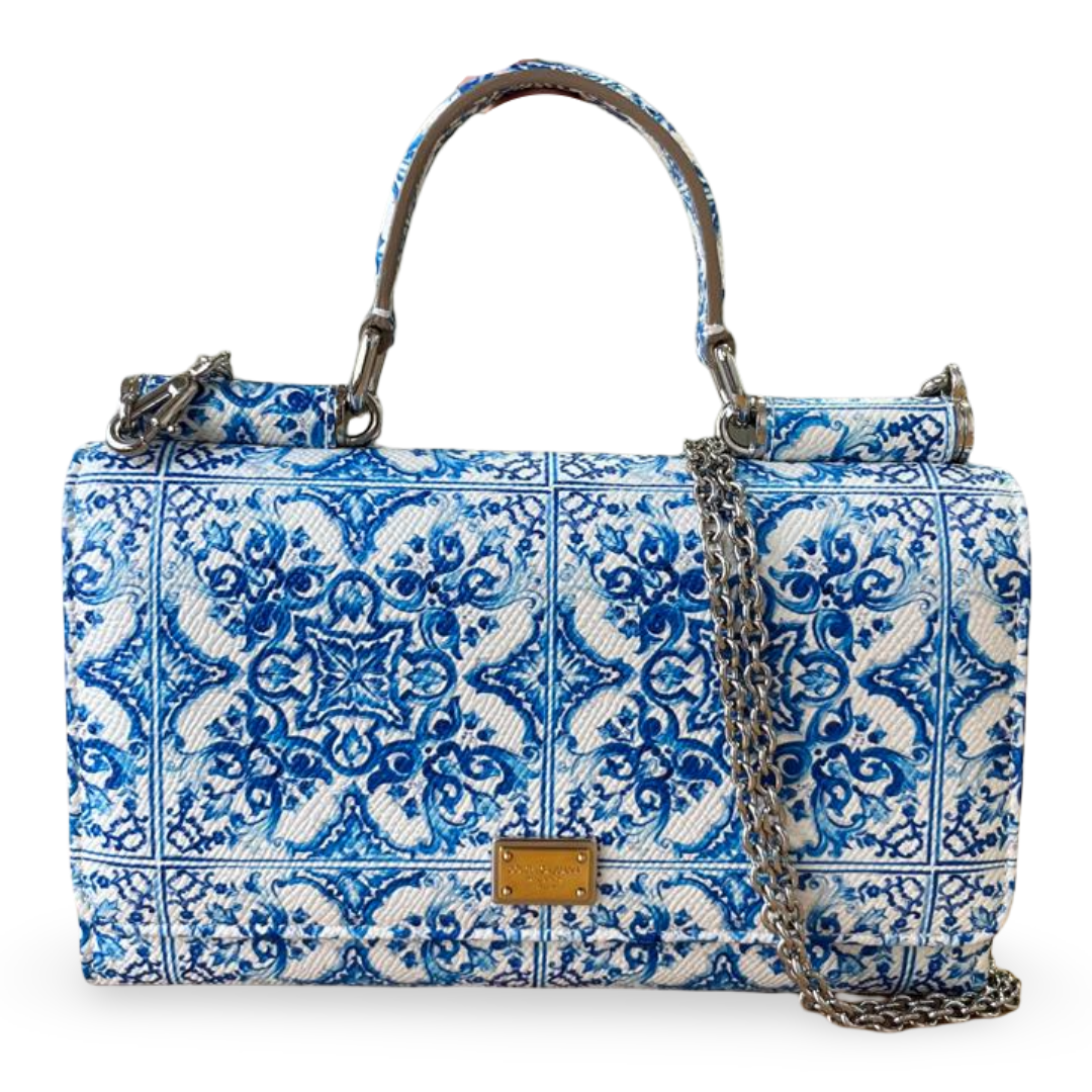 This Dolce & Gabbana Miss Sicily Wallet on Chain beautifully showcases the brand’s iconic Majolica print in striking blue and white on smooth leather. Designed with a structured silhouette, it features a front flap with a magnetic snap closure, gold-tone logo plaque, and a detachable chain shoulder strap, allowing it to be worn as a crossbody or carried as a clutch. The interior is organized with multiple card slots and a zippered coin pocket, making it both chic and functional.