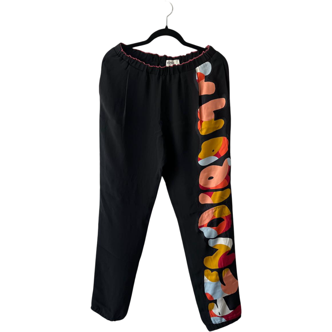 These Fendi jogger pants are made from soft silk and designed with an elasticized waist for comfort. They feature colourful logo detailing on one leg, adding a playful yet luxurious touch. The tapered silhouette makes them versatile enough to dress up or down.