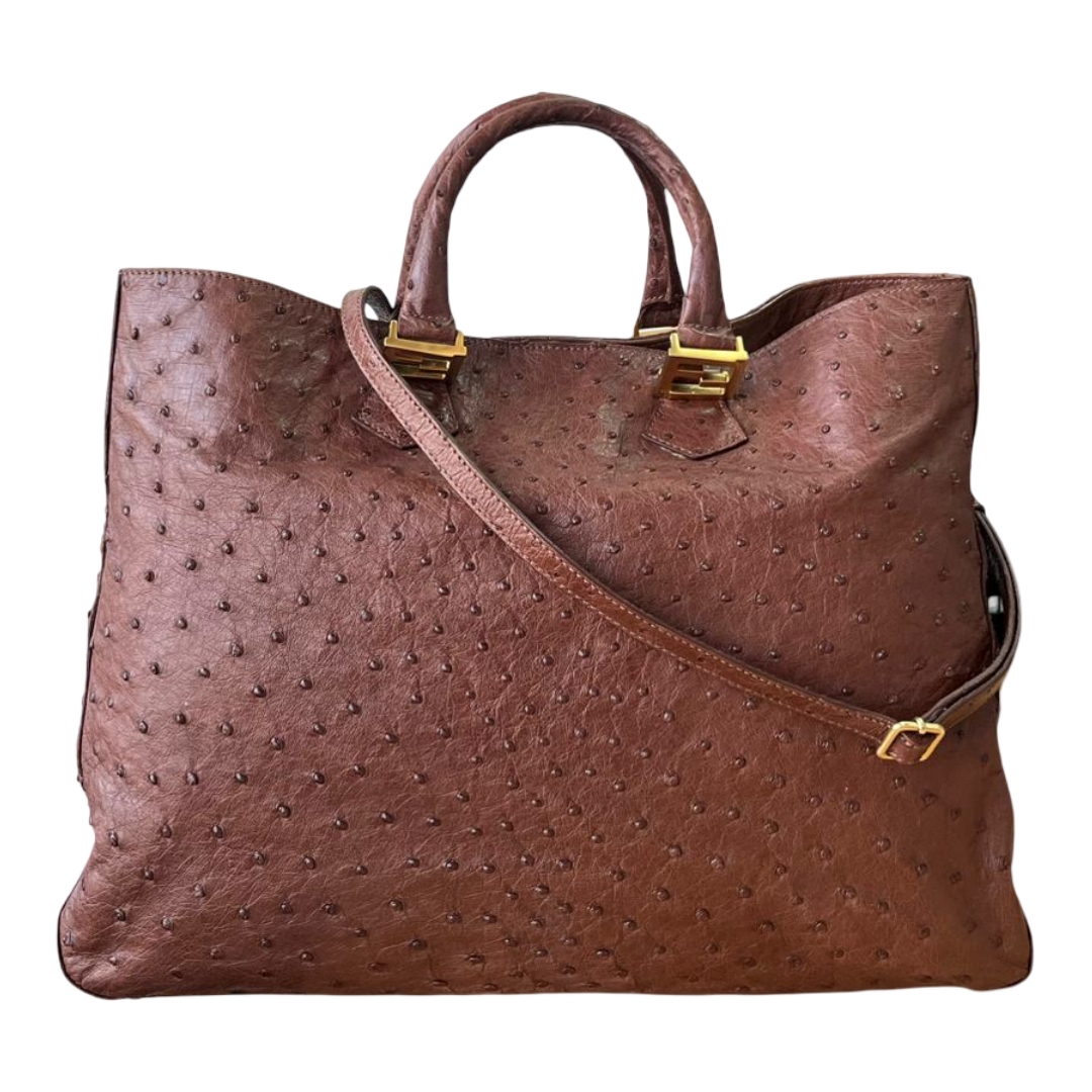 This Fendi Large Twins Shopper Tote is crafted from luxurious dark brown genuine ostrich leather, showcasing the brand’s refined elegance and mastery in exotic materials. Designed in the spacious Twins silhouette, it features dual top handles for easy carry, two practical front flap pockets, and a large open main compartment lined in leather. This tote is perfect for those seeking an investment exotic piece with ample capacity for daily or travel use.