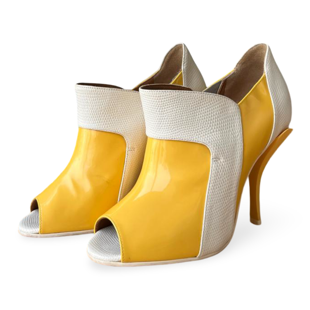 These Fendi peep-toe booties feature a striking combination of yellow patent leather and white leather, creating a bold, modern statement. Designed with a sleek silhouette and peep-toe front, they are perfect for elevating any outfit.