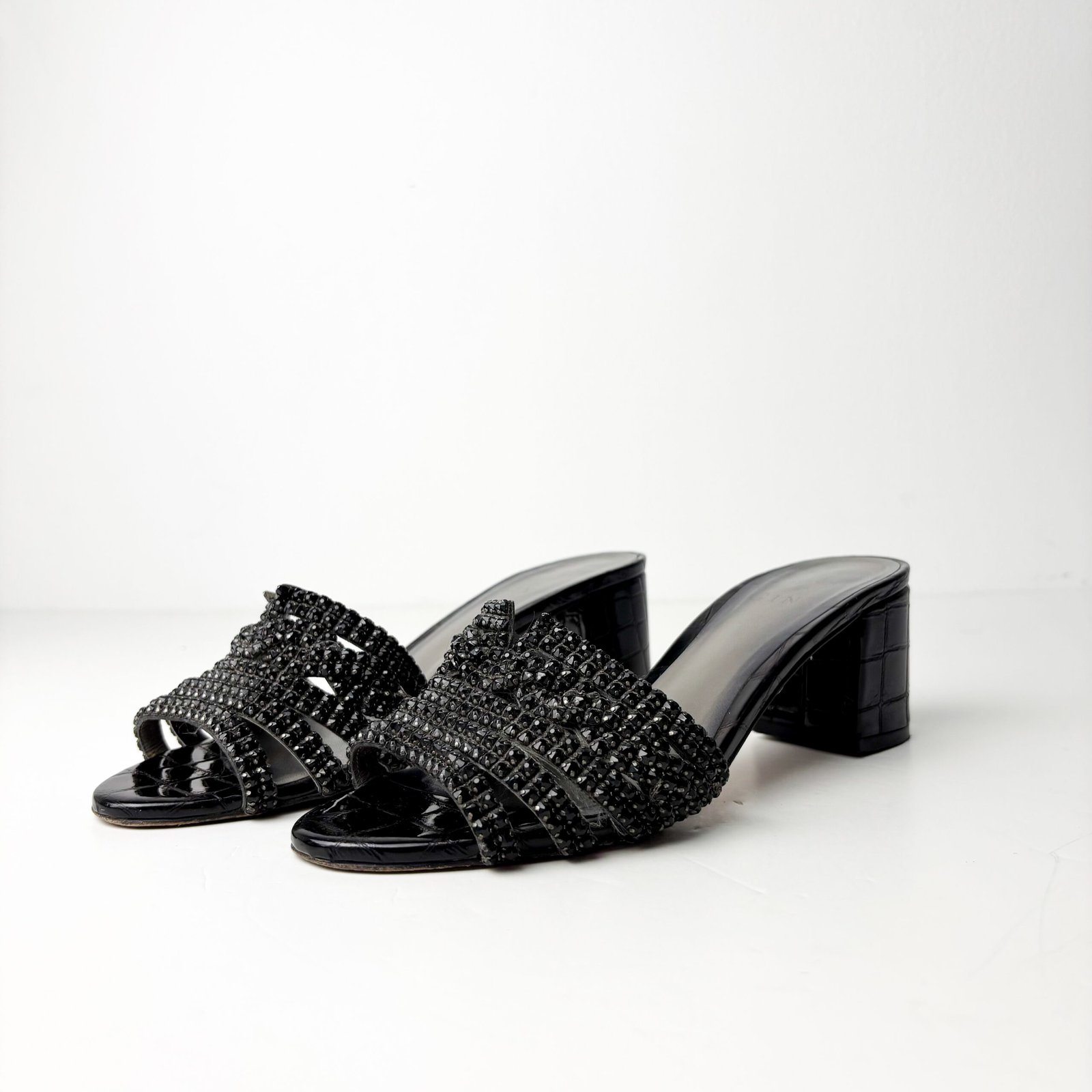 GINA London Black Leather Crystal-Embellished Block Heel Slide Sandals — Size 38