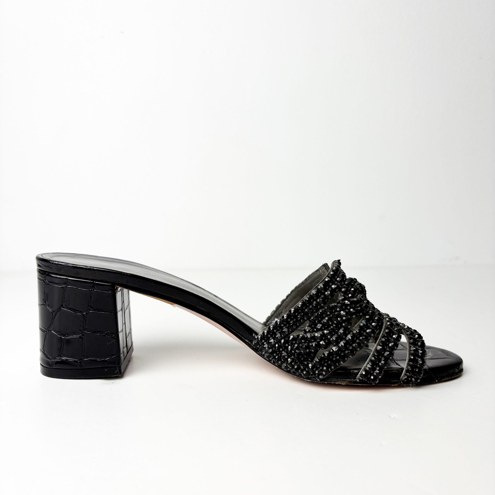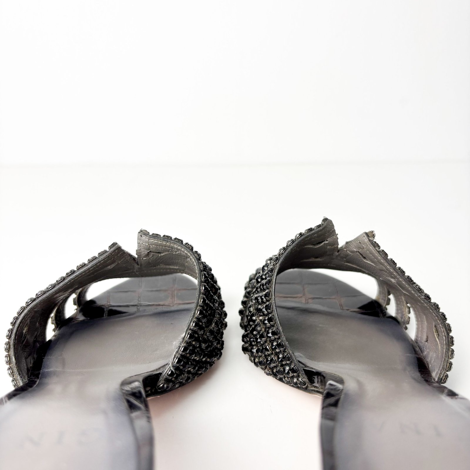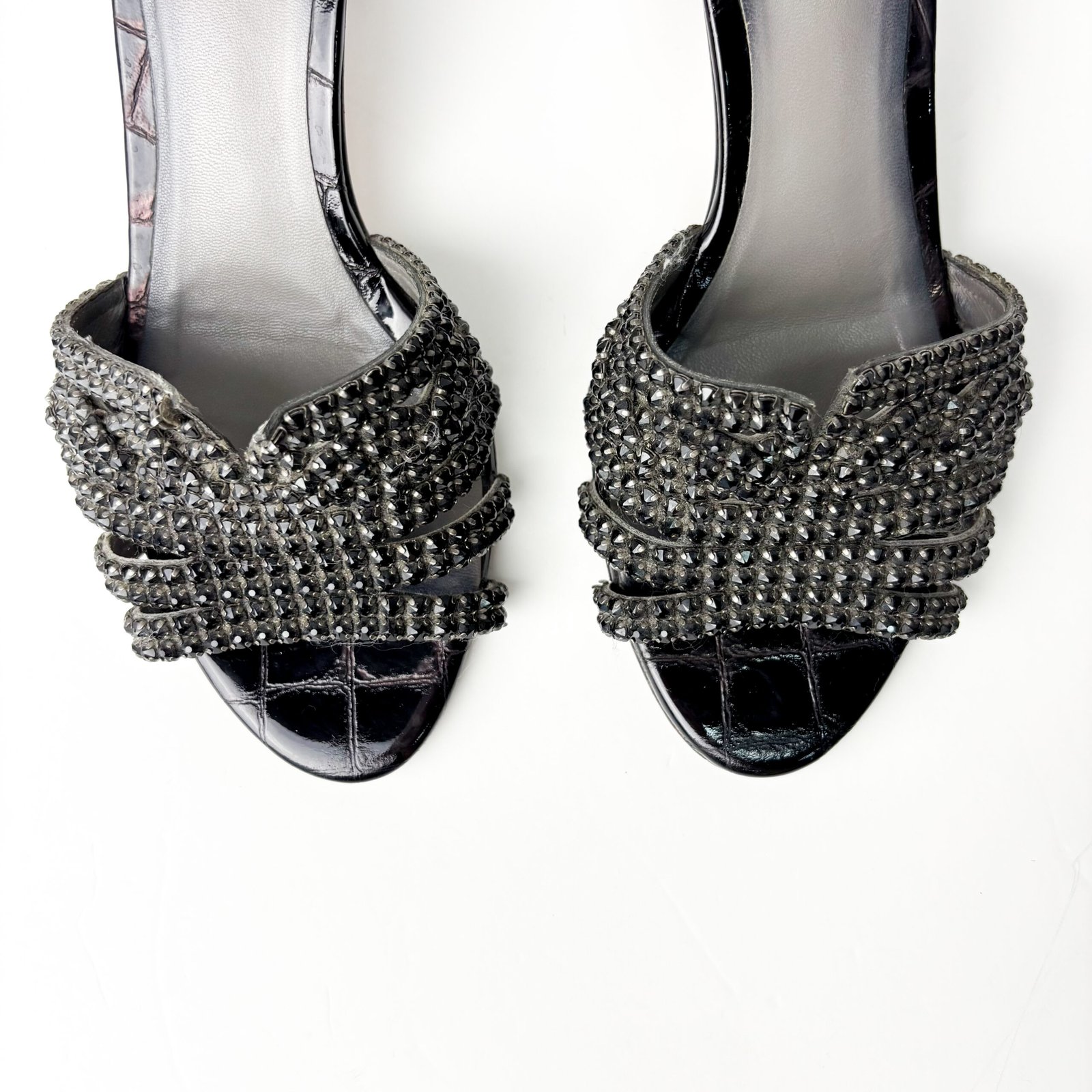 - Condition (Pre-Owned): These sandals are in good pre-owned condition, with intact crystals and sturdy block heels, showing light scuffing at the heel edges. The leather footbeds show toe imprints and darkening, and the outsoles exhibit significant street wear with the black finish worn in the center.