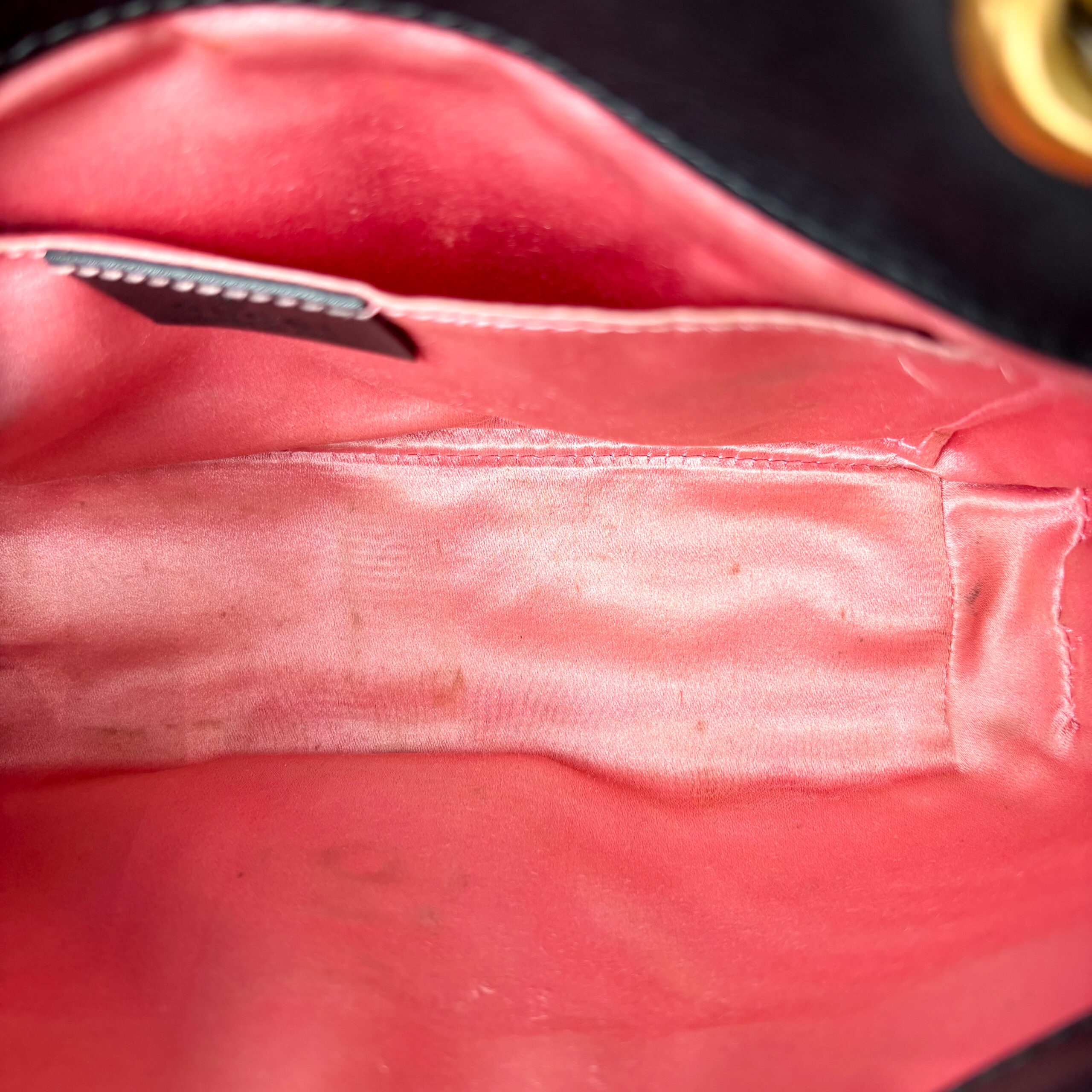 - Pre-Owned Condition: The bag is in good used condition. The most notable issues are the fading of the gold plating on the main logo and the matting of the velvet fabric on the exterior flap.