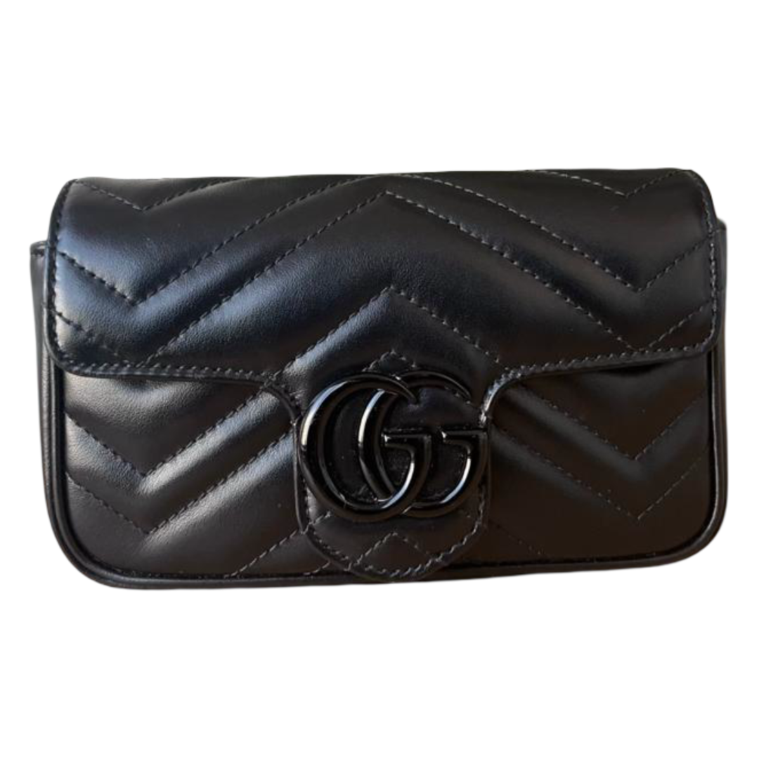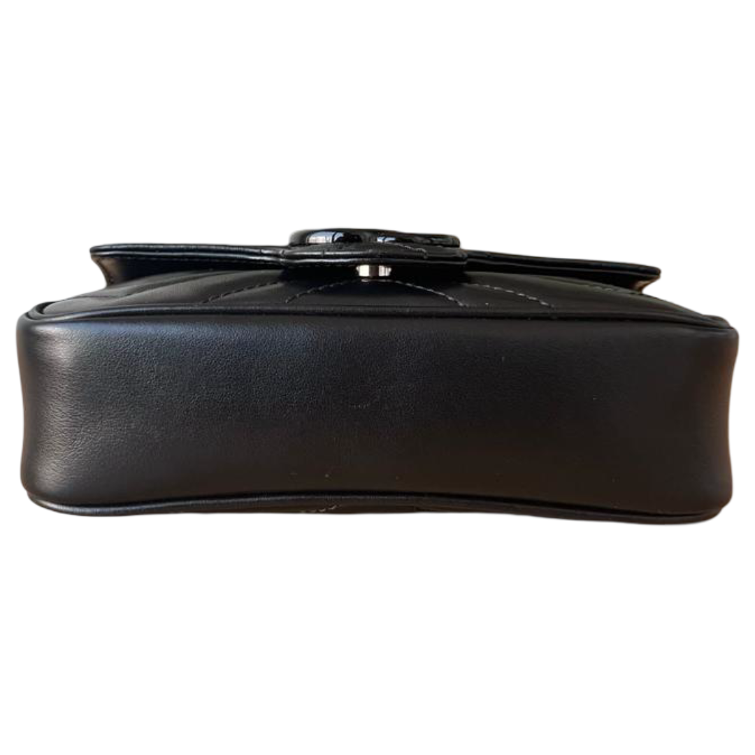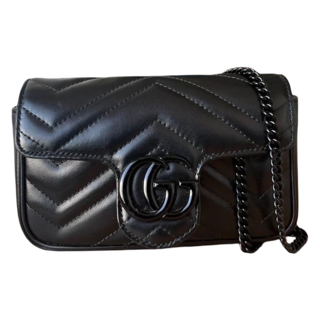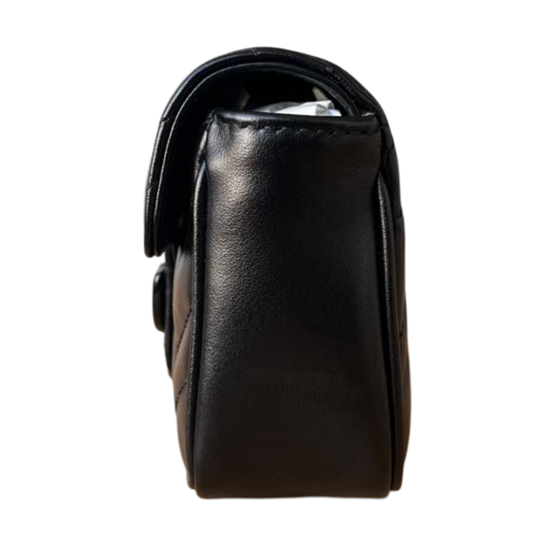 This Gucci GG Marmont Mini Shoulder Bag is crafted from black matelassé chevron leather and features the iconic Double G logo on the front flap. Its softly structured silhouette is complemented by brass hardware with a ceramic effect finish, adding a touch of sophistication. The sliding chain strap allows versatile styling, letting you wear it as a shoulder bag or crossbody.