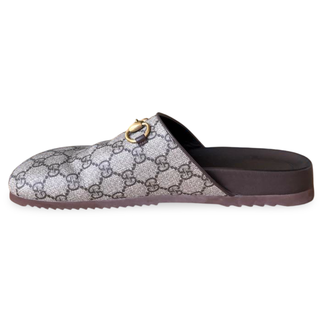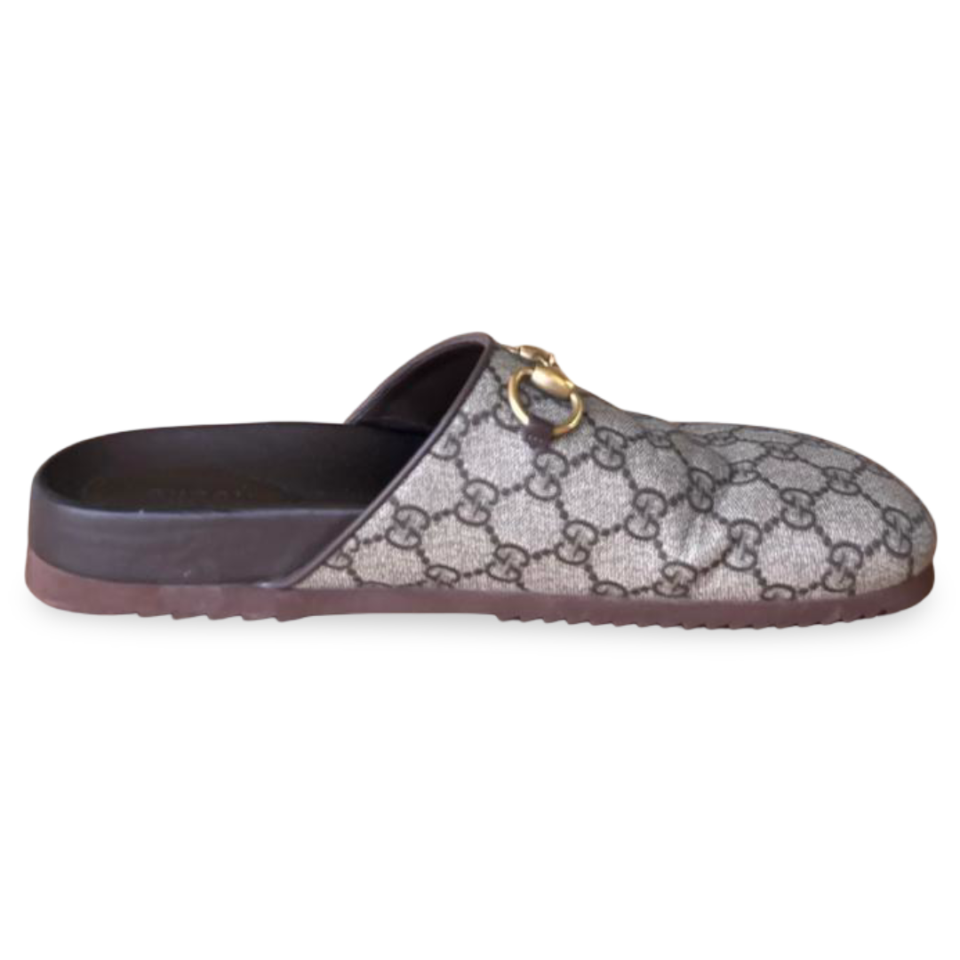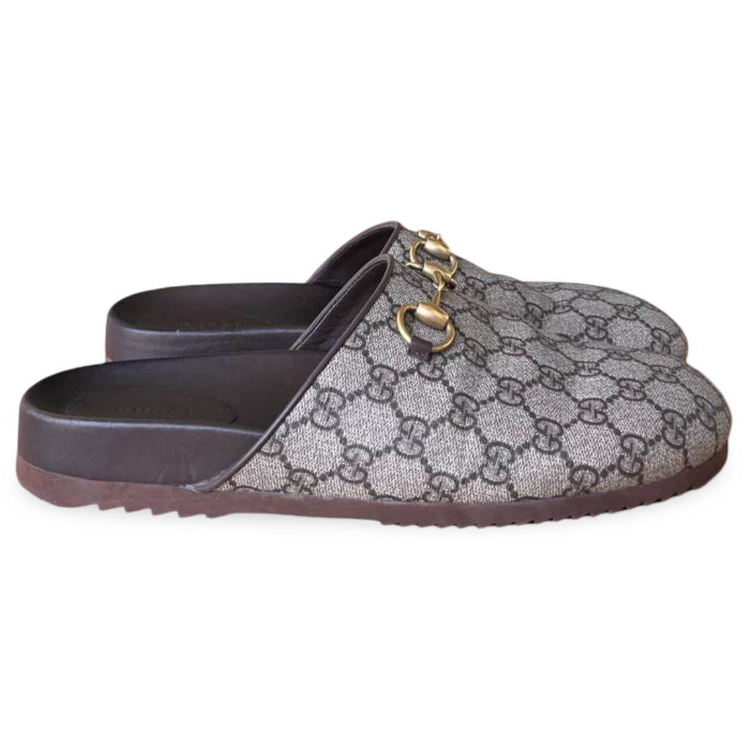 These Gucci slippers are crafted from the brand’s signature GG Supreme canvas in beige and ebony, accented with smooth leather trim. Featuring the iconic gold-tone horsebit hardware, a slip-on silhouette, and leather-lined insoles, they offer timeless elegance with everyday comfort.